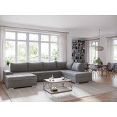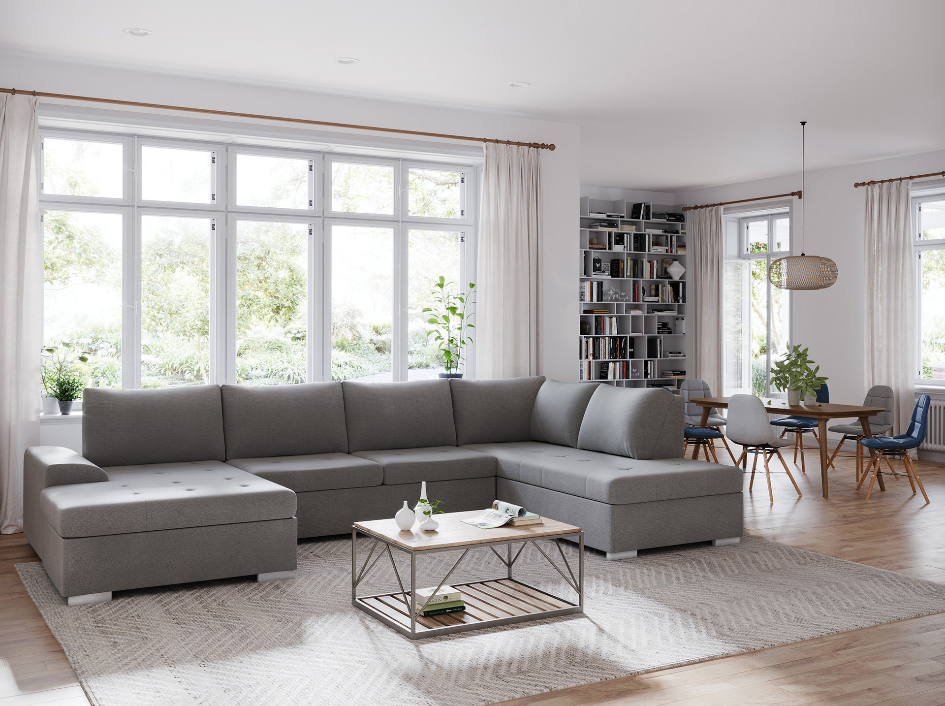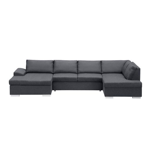 Allié design et fonctionnalité, voila ce que représente ce canapé d'angle panoramique. En effet, ses lignes très épurées allouent à ce canapé un design ultra contemporain qui en séduira plus d'un. Disposant de la fonction convertible et d'un coffre de rangement, ce canapé en tissu sera un véritable atout dans votre salon. Fini le manque de place pour recevoir vos amis, ce canapé 5 places vous offre non seulement une surface assise généreuse pour profiter de moments de partage. Mais également, de façon très rapide et facile, une surface de couchage pour accueillir 2 personnes grâce à son tiroir lit. Optimisez votre espace de rangement grâce à ce canapé d'angle. En effet, dissimulé sous sa grande méridienne, ce canapé dispose d'un coffre de rangement conséquent. Idéal pour ranger vos couettes, vos oreillers d'appoints ou autres, ce coffre de rangement s'ouvre sans difficulté. Ce canapé a été fabriquée en Pologne avec des matériaux de qualité et particulièrement résistants.