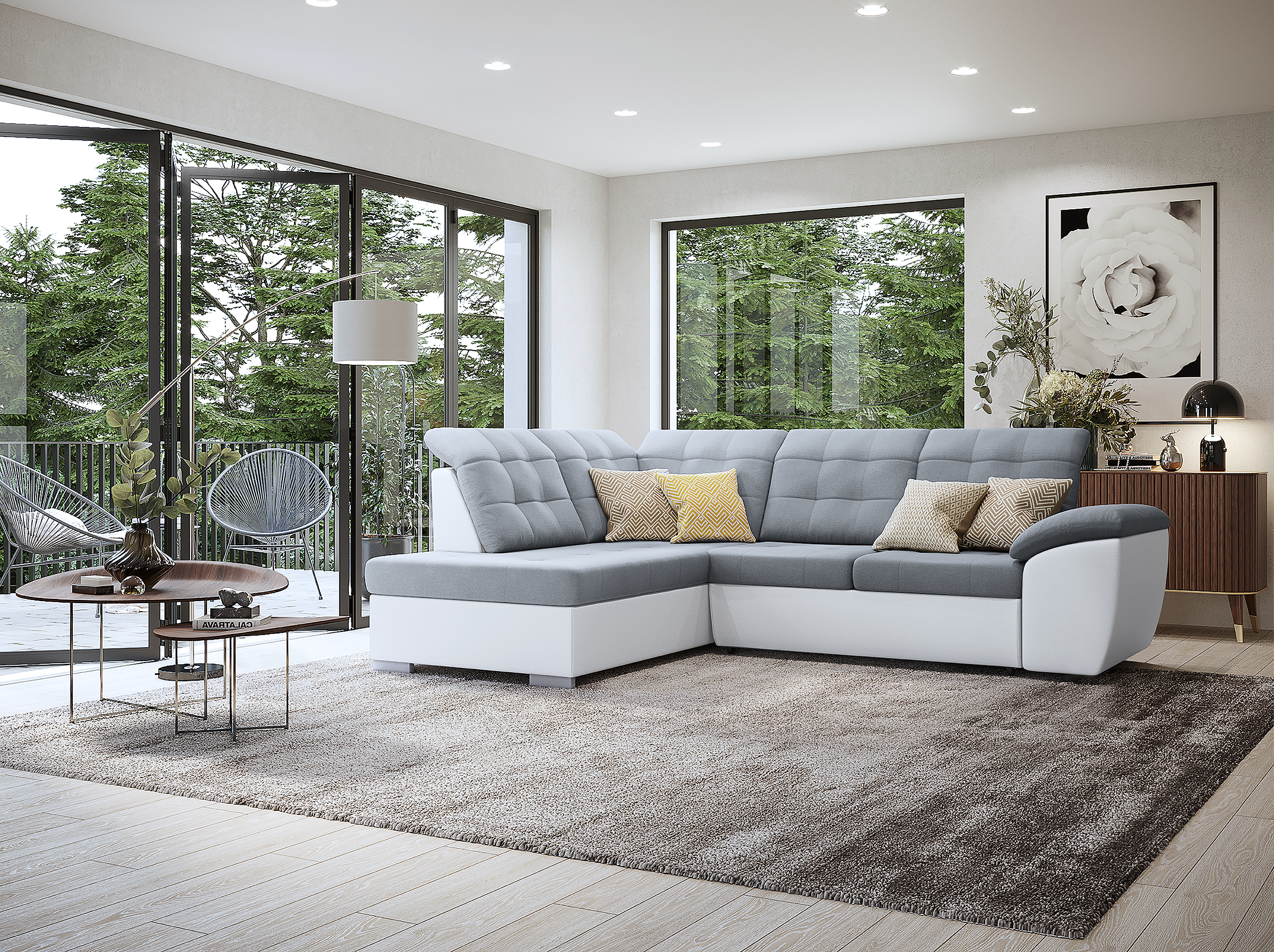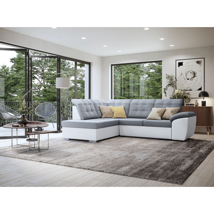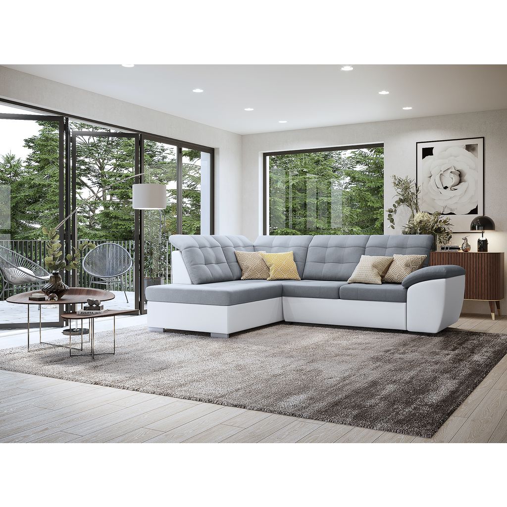 Canapé d'angle gauche convertible avec coffre et repose tête réglable en tissu gris + pu blanc RECITAL