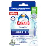 Canard ® Fresh Disc® vous aide à garder vos toilettes propres et fraîches. Sa technologie unique de gel aide à combattre le tartre qui peut retenir les bactéries, tout en prévenant l'accumulation de calcaire. Active Eucalyptus™ : une formule hygiènique et anti-tartre*.Canard® Fresh Disc® rafraîchit les toilettes à chaque chasse, pour un parfum continu 24 heures sur 24, 7 jours sur 7**. Emboîtez, Positionnez, Appliquez : le tour est joué ! Pas besoin de frotter ni de le toucher, l’action de fraîcheur se déclenche automatiquement à chaque chasse d’eau. Canard® Fresh Disc® convient aux fosses septiques dans les conditions normales d’utilisation. Pour des toilettes propres et fraîches en un clin d’oeil, utilisez notre Fresh Disc® en duo avec le Gel Nettoyant Canard®. Tout d’abord, utilisez le gel Canard® sous les rebords, pressez, puis brossez au-dessus et au-dessous de la surface de l'eau. Une fois chose faite, appliquez une pastille de Canard ® Fresh Disc®. Canard ® Fresh Disc® existe aussi en recharges, une solution économique avec moins de plastique***.