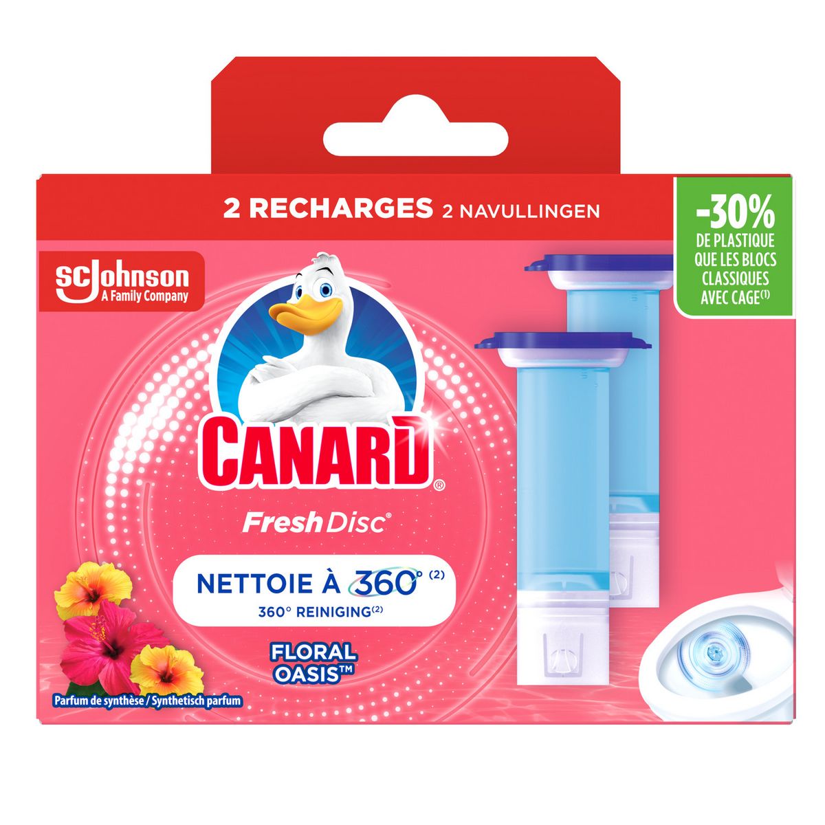 Les recharges Canard ® Fresh Disc®: une solution économique avec moins de plastique*. Canard ® Fresh Disc® vous aide à garder vos toilettes propres et fraîches. Sa technologie unique de gel nettoie à 360°** et aide à combattre le tartre qui peut retenir les bactéries, tout en prévenant l'accumulation de calcaire. Canard® Fresh Disc® rafraîchit les toilettes à chaque chasse, pour un parfum continu 24 heures sur 24, 7 jours sur 7***. Emboîtez, Positionnez, Appliquez : le tour est joué ! Pas besoin de frotter ni de le toucher, l’action de fraîcheur se déclenche automatiquement à chaque chasse d’eau. Canard® Fresh Disc® convient aux fosses septiques dans les conditions normales d’utilisation. Pour des toilettes propres et fraîches en un clin d’oeil, utilisez notre Fresh Disc® en duo avec le Gel Nettoyant Canard®. Tout d’abord, utilisez le gel Canard® sous les rebords, pressez, puis brossez au-dessus et au-dessous de la surface de l'eau. Une fois chose faite, appliquez une pastille de Canard ® Fresh Disc®.