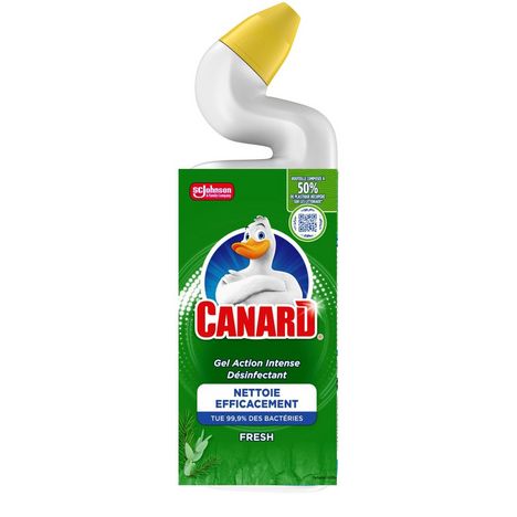 Gel Canard Action Intense Fresh : le héros de vos toilettes ! Faites briller vos toilettes avec ce gel nettoyant ultra-efficace. Il élimine 99,9% des bactéries et dissout le tartre, le calcaire et les saletés tenaces, même sous les rebords** (les zones que même votre brosse préfère éviter). Grâce à son bec verseur unique, Canard vise juste et nettoie là où ça compte vraiment. En bonus, il chasse les mauvaises odeurs et laisse derrière lui un sillage frais et vivifiant, aux notes de pin qui durent longtemps. Votre nez vous dira merci. Vos toilettes aussi. Pour l’utiliser, pas besoin de super-pouvoirs : inclinez, appliquez, brossez puis tirez la chasse. Canard s’occupe du reste ! Et parce que propreté rime aussi avec responsabilité, chaque flacon est fabriqué à partir de 50% de plastique récupéré sur les littoraux, en partenariat avec Plastic Bank.* * Les déchets sont collectés à moins de 50 km des côtes pour éviter qu’ils ne finissent dans les océans ou les décharges ** Testé en laboratoire en situation réelle (nettoyage sous les rebords, sur des toilettes à rebords ouverts) Utilisez les produits désinfectants avec précaution. Avant toute utilisation, lisez l'étiquette et les informations concernant le produit.