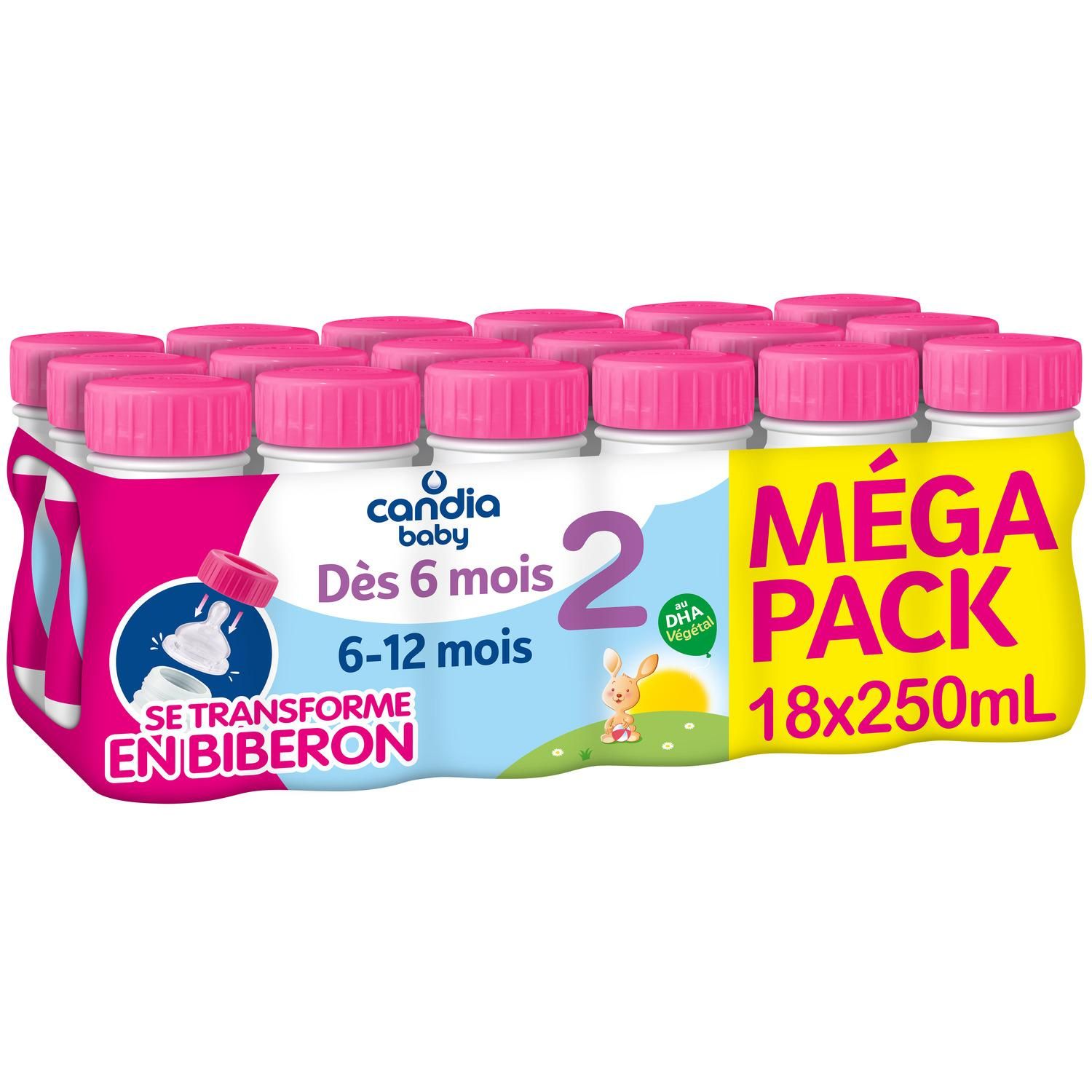 Toute l'expertise et la praticité du lait infantile liquide Candia Baby Dès 6 mois. Du lait pour bébé 2ème âge dans un format 25cl Tétinable, il suffit d'insérer une tétine à col large dans le bouchon, et la bouteille se transforme en biberon ! Format Méga pack x18 : 1 semaine de consommation + 2 jours de sécurité.