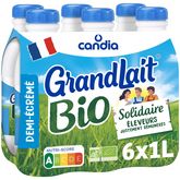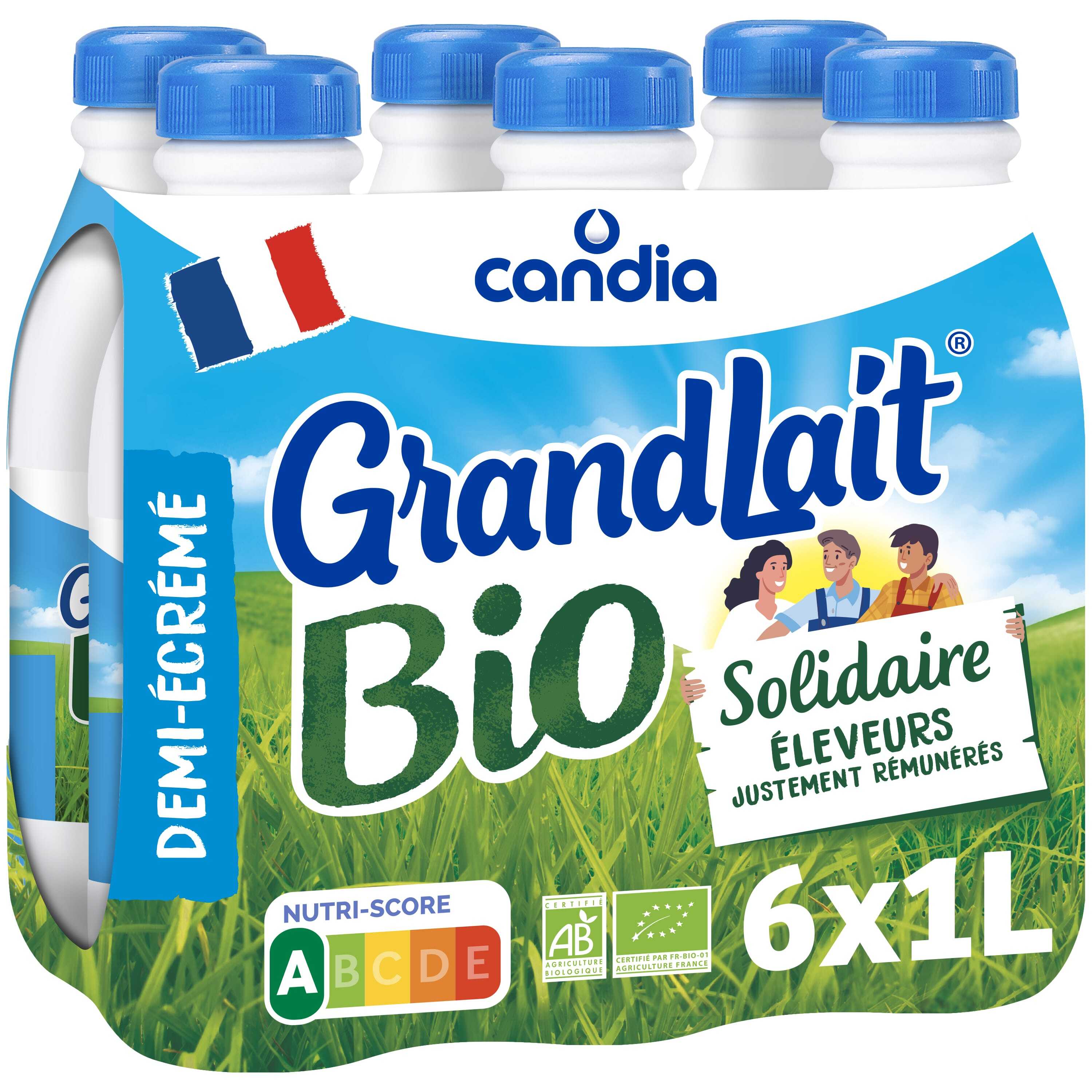 GrandLait Bio Demi-écrémé est un lait Bio issu de coopérative et 100% français. Il est intégré dans la démarche Le Bio Pré de Vous, avec des fermes de 60 vaches en moyenne (à juillet 2023), au pâturage >180j/an, un engagement de maîtrise de l'empreinte carbone et une meilleure rémunération des éleveurs. GrandLait Bio se positionne pour des emballages plus durables : film comportant au moins 50% de matières recyclées et utilisation d'une nouvelle approche de recyclage pour ses bouteilles (équilibre des masses).