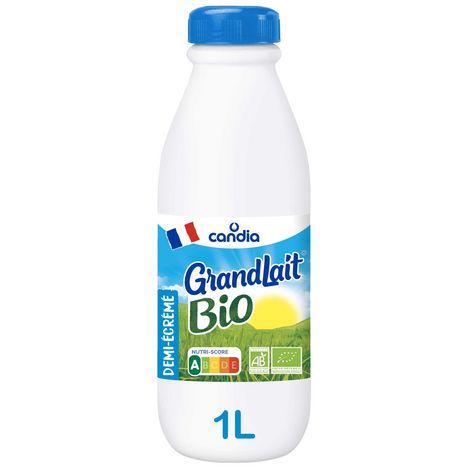 GrandLait Bio Demi-écrémé est un lait Bio issu de coopérative et 100% français. Il est intégré dans la démarche Le Bio Pré de Vous, avec des fermes de 60 vaches en moyenne (à juillet 2023), au pâturage >180j/an, un engagement de maîtrise de l'empreinte carbone et une meilleure rémunération des éleveurs. GrandLait Bio se positionne pour des emballages plus durables : film comportant au moins 50% de matières recyclées et utilisation d'une nouvelle approche de recyclage pour ses bouteilles (équilibre des masses).