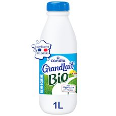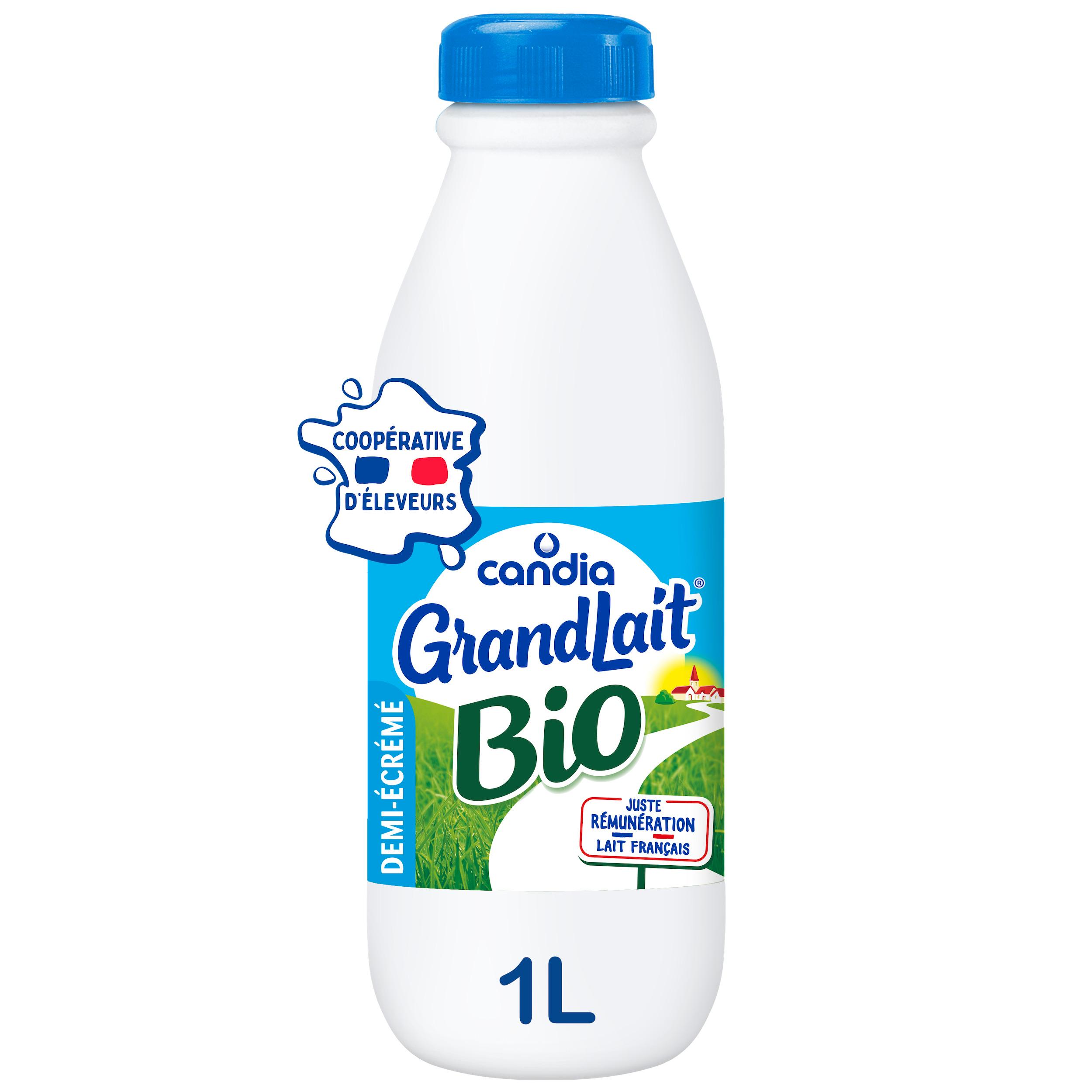 GrandLait Bio Demi-écrémé est un lait Bio issu de coopérative et 100% français. Il est intégré dans la démarche Le Bio Pré de Vous, avec des fermes de 60 vaches en moyenne (à juillet 2023), au pâturage >180j/an, un engagement de maîtrise de l'empreinte carbone et une meilleure rémunération des éleveurs. GrandLait Bio se positionne pour des emballages plus durables : film comportant au moins 50% de matières recyclées et utilisation d'une nouvelle approche de recyclage pour ses bouteilles (équilibre des masses). Les laits de consommation et les boissons lactées sont désormais classés dans la catégorie des boissons dans l'algorithme Nutri-Score. Dans cette nouvelle version de l'algorithme, seule l'eau peut obtenir la note A. Ainsi, la meilleure note possible pour toutes les autres boissons, y compris le lait, est B.