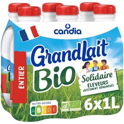 GrandLait Bio Entier est un lait Bio issu de coopérative et 100% français. Il est intégré dans la démarche Le Bio Pré de Vous, avec des fermes de 60 vaches en moyenne (à juillet 2023), au pâturage >180j/an, un engagement de maîtrise de l'empreinte carbone et une meilleure rémunération des éleveurs. GrandLait Bio se positionne pour des emballages plus durables : film comportant au moins 50% de matières recyclées et utilisation d'une nouvelle approche de recyclage pour ses bouteilles (équilibre des masses).