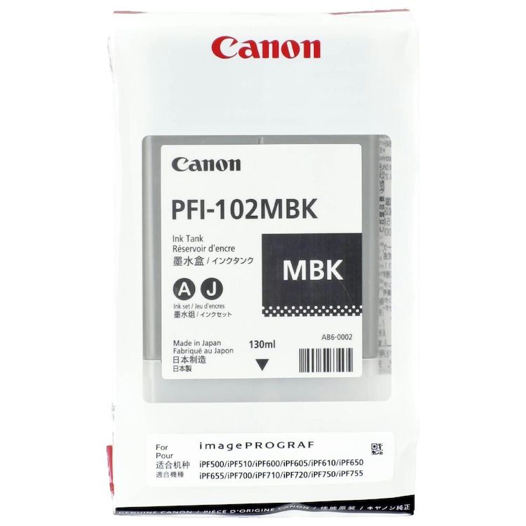 La cartouche d'encre Canon LUCIA PFI-102MBK est conçue pour les imprimantes Canon imagePROGRAF iPF510, iPF650, iPF655, iPF720, iPF750, iPF755, iPF760, iPF765, LP17, LP24. Il s'agit d'une cartouche d'encre noire mate originale avec une capacité de 130 ml. L'encre à pigments offre une excellente quali