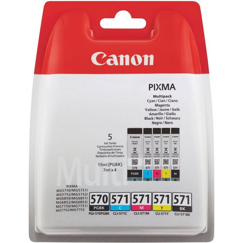 Découvrez le pack de cartouches d'encre Canon PGI-570PGBK + CLI-571, un kit original conçu pour les imprimantes Canon Pixma MG5750, MG5751, MG5752, MG5753, MG6850, MG6851, MG6852, MG6853, MG7750 et MG7751. Ce pack multipack contient une cartouche noire pigmentée de 15 ml et quatre cartouches couleur cyan, magenta, jaune, et noir de 7 ml chacune. Les cartouches assurent une impression haute qualité avec des textes nets et des couleurs éclatantes. Emballé en blister, ce produit garantit une utilisation facile et une compatibilité parfaite. Optez pour l'originalité et bénéficiez d'une fiabilité optimale pour vos impressions photo et documents professionnels.