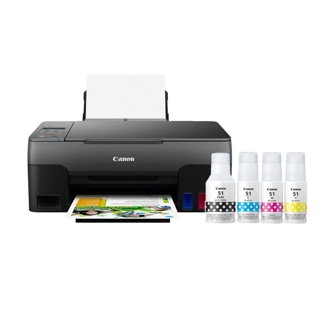 Imprime, Scanne, Copie - Résolution impression 4800 x 1200 dpi- Vitesse impression noir 9.1ppm - Vitesse impression couleur 5ppm - Résolution numérisation 600 x 1200ppi - WiFi - Bouteille d'encre noire GI-51 PBGK - 3 bouteilles d'encre couleurs GI-51 - Garantie d'une année supplémentaire après inscription sur le site Canon