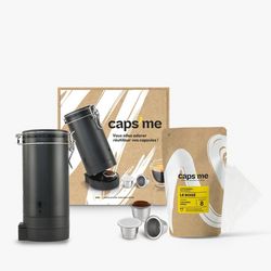 | Livré avec | 1 rechargeur de capsules noir + 3 Capsules réutilisables + 48 Opercules compostables + Café moulu 200g | |