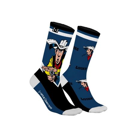 Shoote dans le Far West avec ces chaussettes dépareillées Lucky Luke Capslab ! Le mélange audacieux de couleurs (bleu, blanc, noir, jaune, rouge) évoque l'univers du cow-boy solitaire. Coupe haute, style fantaisie et composition chaude & stretch (70% coton, 28% polyamide, 2% élasthanne) : elles allient fun, confort et robustesse. Lavage à 30° facile, disponibles en 39-42 et 43-46. Parfait pour galoper toute la journée... avec style.
