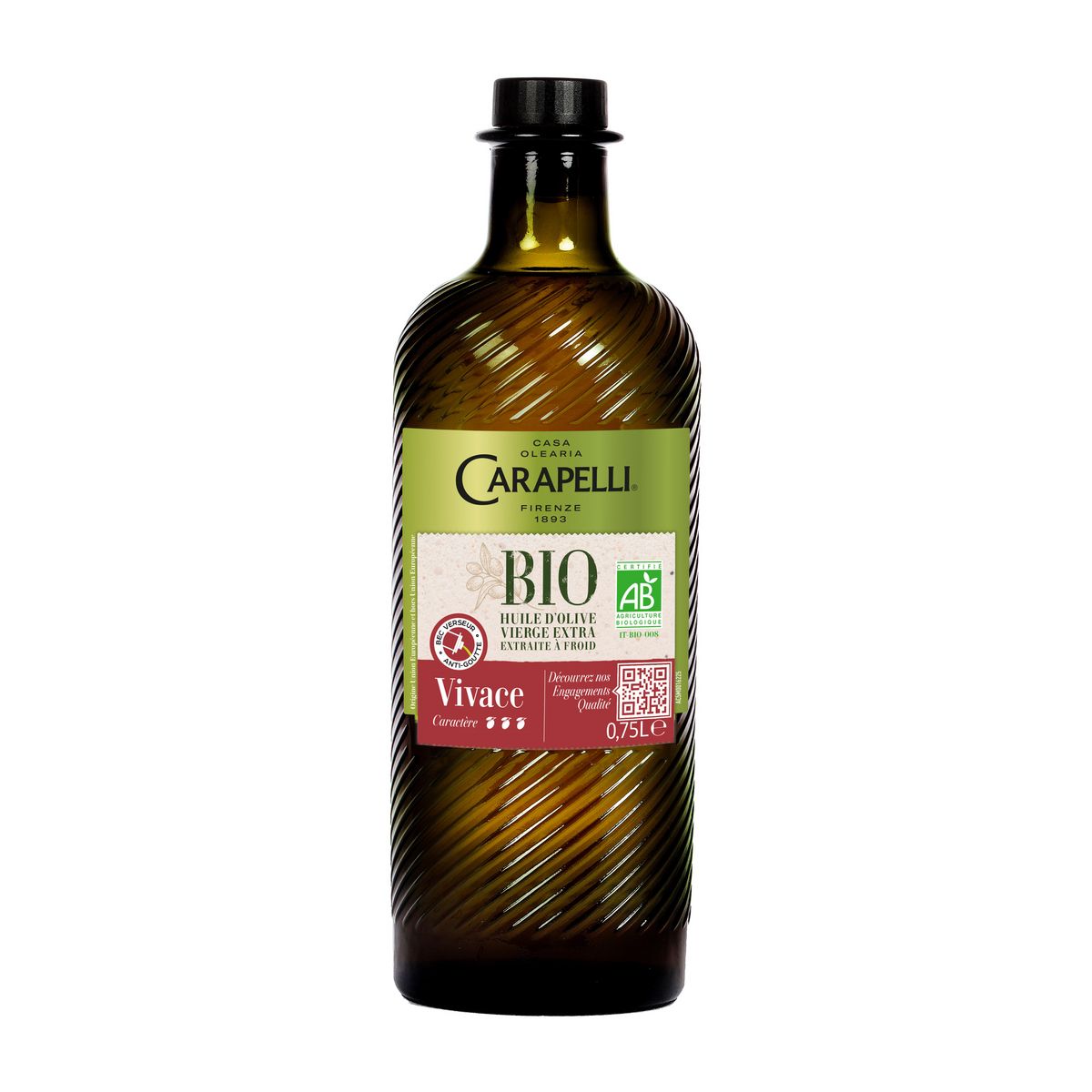 Huile d’olive Vierge Extra Bio Vivace Carapelli, extraite à froid et issue de l'Agriculture Biologique. Au caractère fruité et intense, elle est idéale pour la cuisson comme pour l’assaisonnement. Son bec verseur offre un dosage précis à chaque utilisation.
