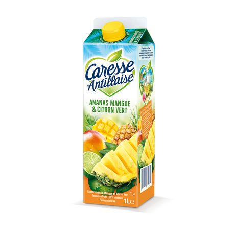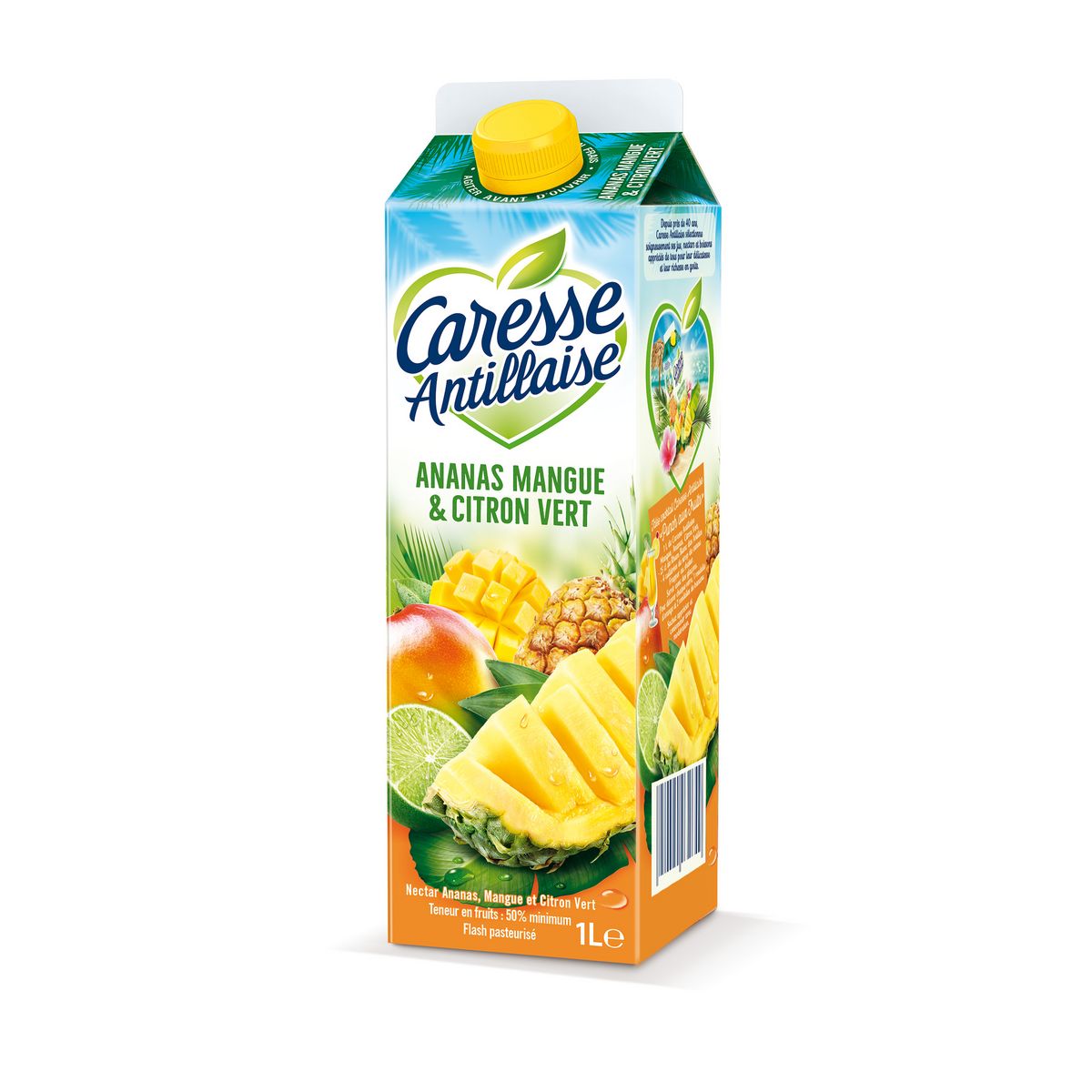 Ingrédients : jus et purée de fruits 50% (ananas 38%, mangue 10%, citron vert 2 %), eau, sucre, acidifiant : acide citrique.