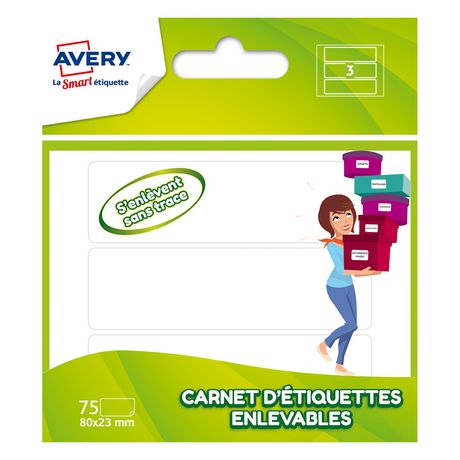 En savoir +Carnet comprenant 75 étiquettes blanches adhésives de format 45 x 30 mm. Leur adhésif enlevable permet d’étiqueter de façon propre et ferme sur tous types de supports : livres, dossiers, boîtes, documents, bocaux, meubles… L'étiquette peut ensuite être enlever sans laisser de trace de colle. Application sur de multiples surfaces lisses : papier, carton, plastique, verre, bois.