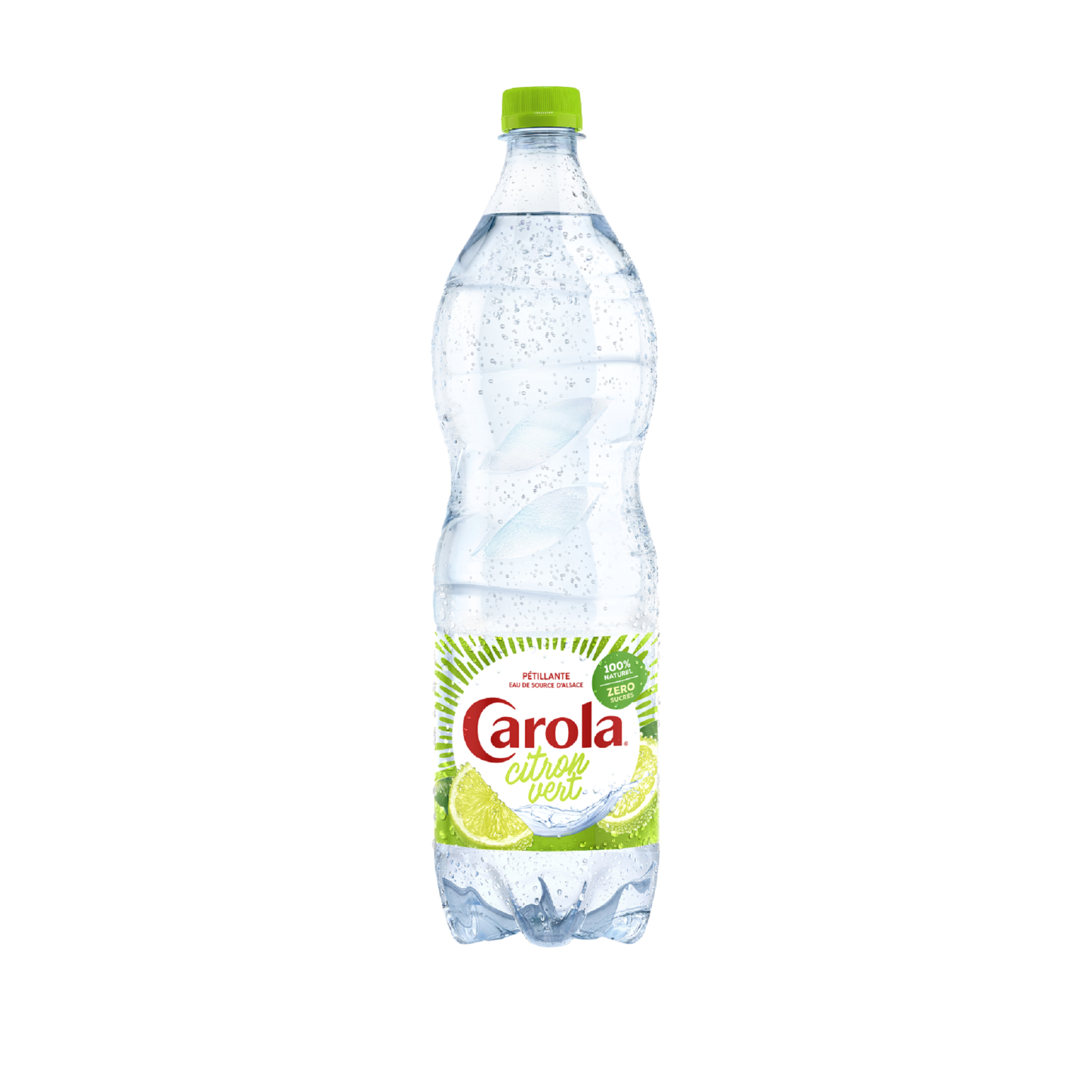 Eau de source CAROLA gazéifiée 99,9%, arômes naturels de citron vert et de citron