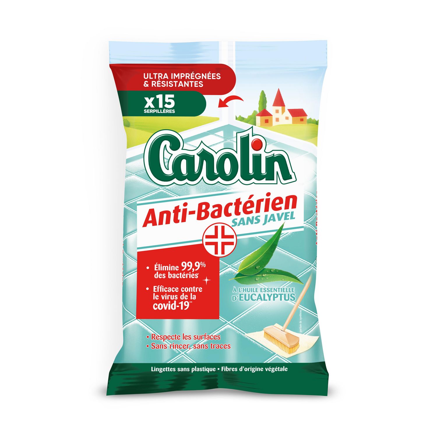 CAROLIN LINGETTES RESIST+ SOL ANTIBACT EUCALYPTYS PACK PLASTIQUE RECYCLEX15