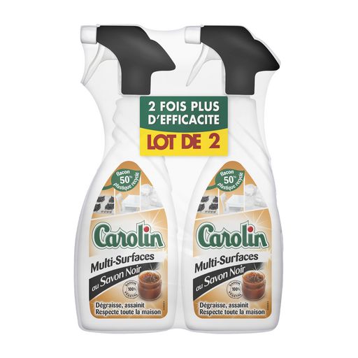 Carolin Pistolet Multi-surfaces au Savon noir 2x650ml Nettoie en profondeur, dégraisse, assainie et fait briller toutes les surfaces de la maison avec un maximum de respect. Il détache même le linge en prélavage. Une recette riche en savon d'origine 100% végétale, sans phosphates, sans phtalates, sans paraben ou autres conservateurs pour un nettoyage efficace mais respectueux des surfaces et de la famille.