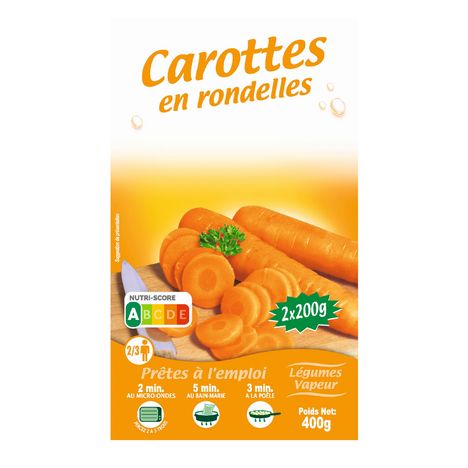 Carottes épluchées, en rondelles, sous-vide, cuites, stérilisées.