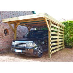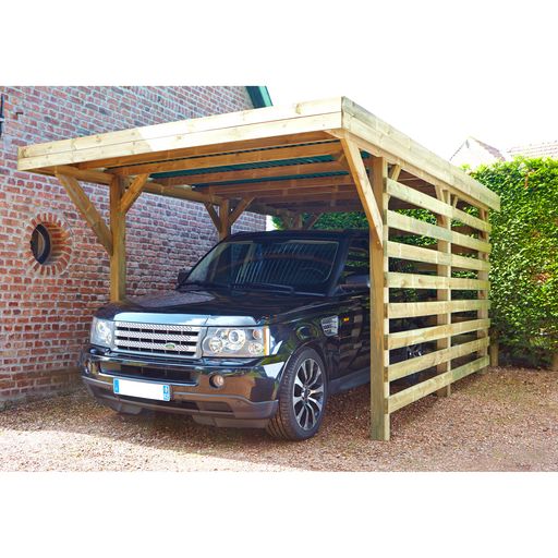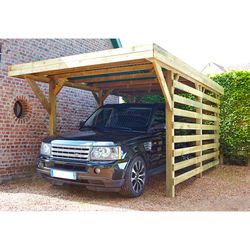Le carport de bois Yaraka est très esthétique. Il est équipé de cloisons pour délimiter parfaitement l'espace de stationnement. Vous pourrez y adosser vos deux roues très facilement. La surface de ce carport est de 15,50m², il peut accueillir une voiture. Couverture en polycarbonate gris anthracite.