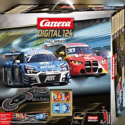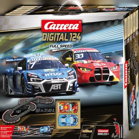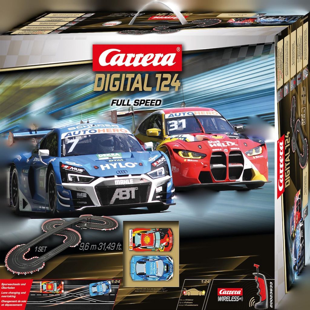 Découvrez le circuit de course Carrera Full Speed, un set immersif comportant une piste numérique de 9,6 mètres. Le pack comprend deux voitures, l'Audi R8 LMS et la BMW M4, équipées de lumières LED pour un réalisme spectaculaire. Les contrôleurs sans fil permettent de régler la vitesse et la puissan