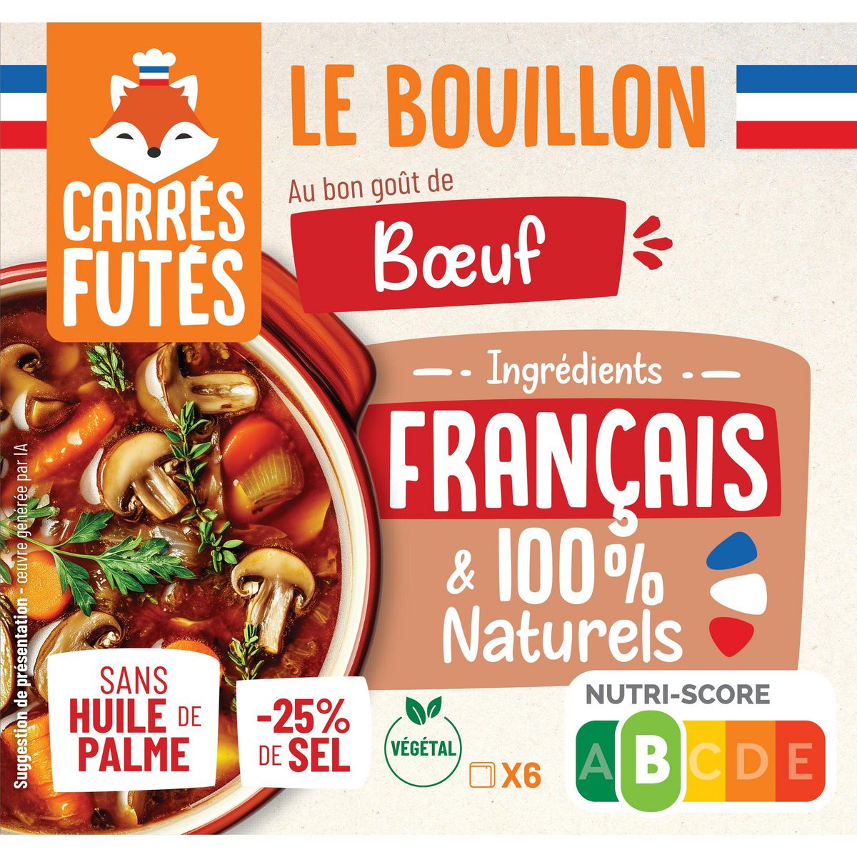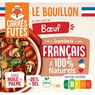 Le bouillon au bon goût de boeuf français Carrés Futés est fabriqué en France à partir d'ingrédients français. C'est le premier bouillon 100% français sur le marché. Et ce n'est pas tout ! Ce bouillon Carrés Futés est aussi sans huile de palme, réduit en sel, sans sucre ajouté et 100% naturel et végétal ! Vous allez vous régaler tout en cuisinant de bons produits français