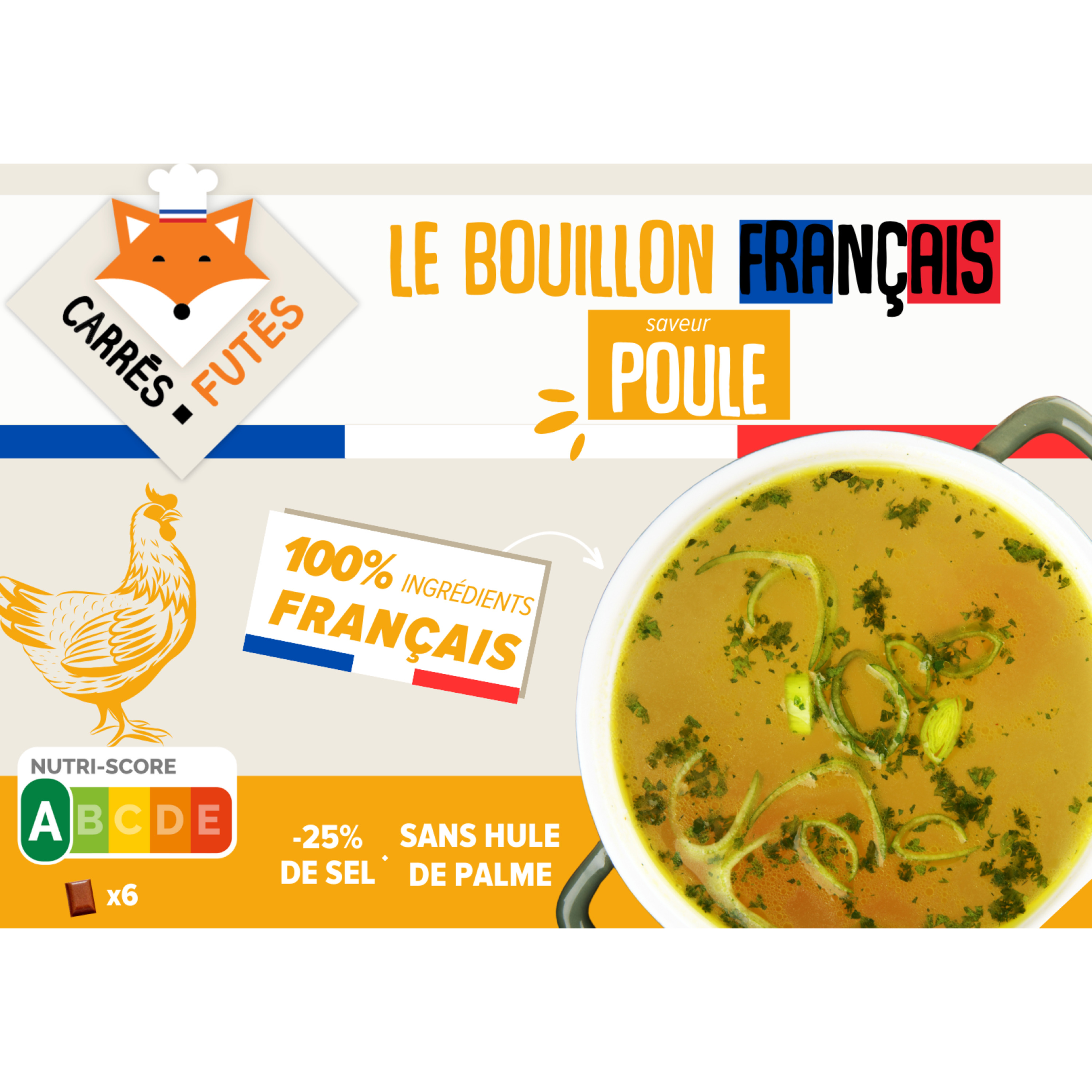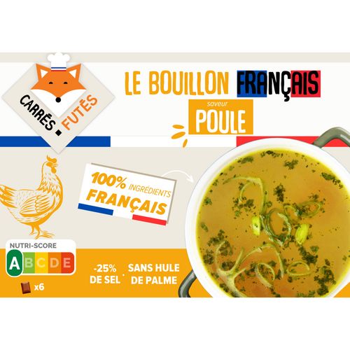 Le bouillon de volaille veggie français Carrés Futés est fabriqué en France à partir ingrédients 100% français. C'est le premier bouillon 100% français sur le marché. Et ce n'est pas tout ! Ce bouillon de de volaille veggie Carrés Futés est aussi sans huile de palme, réduit en sel et 100% naturel ! Vous allez vous régaler tout en cuisinant de bons produits français
