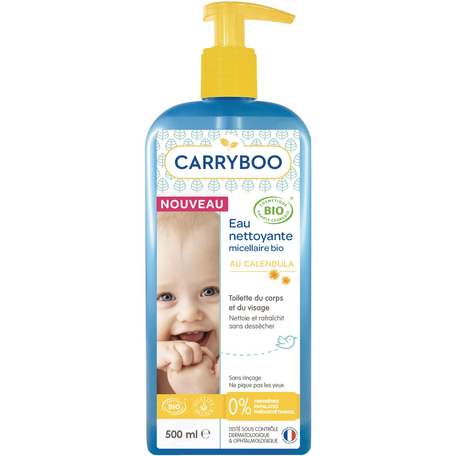 L'Eau Nettoyante Micellaire Carryboo, possède une formule unique destinée à éliminer les impuretés grâce à son effet émollient. Ses tensioactifs et ses micelles éliminent efficacement et, en douceur les impuretés de la peau de bébé, qui en sort fraîche et purifiée. Grâce à ses propriétés hydratantes , l'Eau Nettoyante Micellaire Bio Carryboo respecte l'équilibre cutanée de toutes les peaux, mêmes les plus fragiles. Sa formule enrichie au Calendula adoucit la peau de bébé et apaise le feu des irritations. Parfum d'origine naturel obtenu par décoction de plantes à base d'eau, sans savon, testée ophtalmologiquement, ne pique donc pas les yeux. Elle peut être utilisée sur le siège comme sur le visage de bébé. Fabriquée en France. Eau Nettoyante Micellaire au Calendula Bio