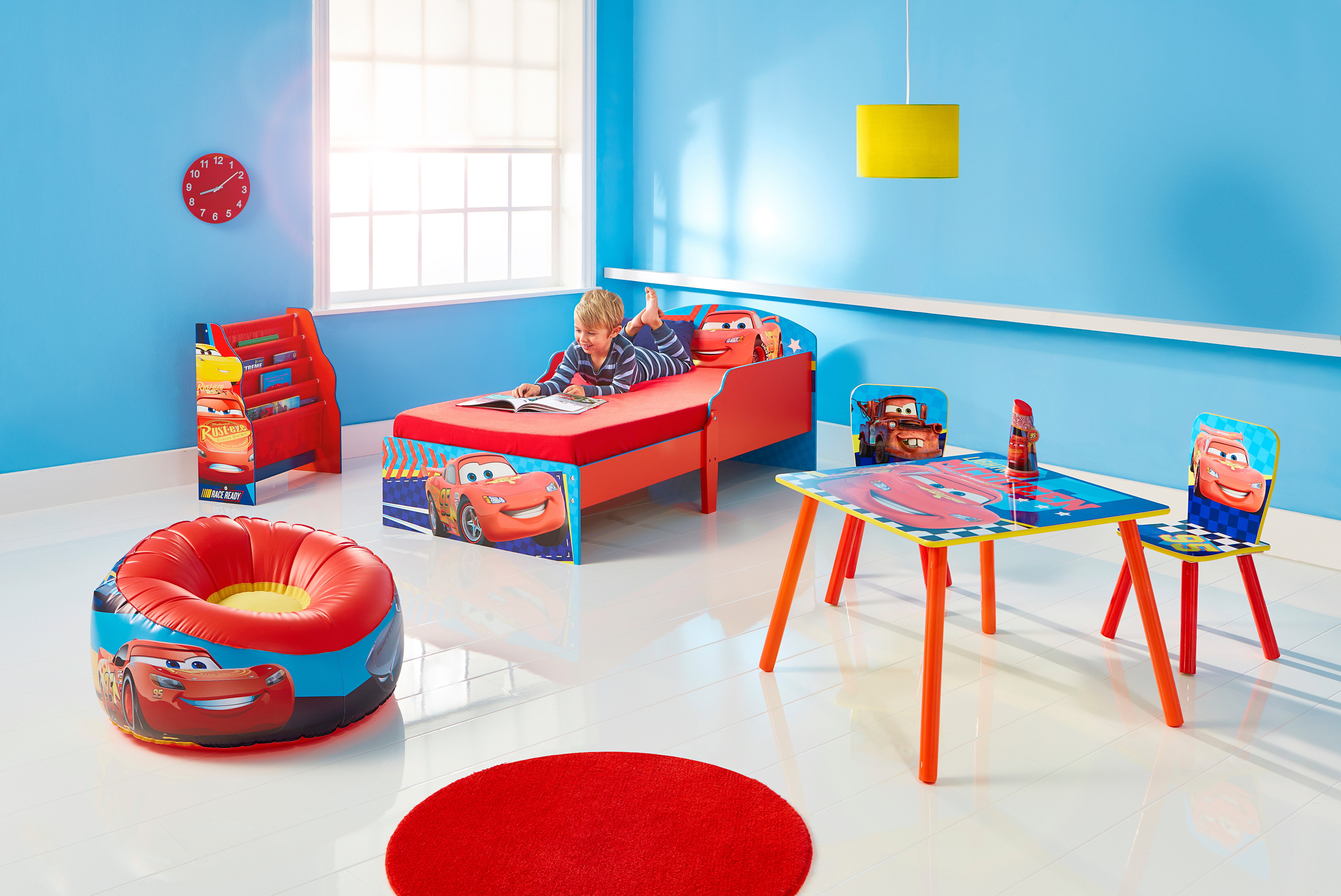 En savoir +Laissez vous séduire par ce superbe ensemble CARS pour chambre d'enfant arborant de jolies couleurs, vous pourrez meubler d'une traite et facilement la pièce de votre petit bout. Ce pack est complet et propose un lit de couchage 70x140cm disposant de rebords de sécurité afin que l'enfant ne puisse pas tomber, une table accompagnée de 2 chaises pour des séances de dessins et d'écritures à volonté, une petite bibliothèque pour ranger ses livres suivi d'un pouf gonflable très confortable pour la lecture. Inclus également une veilleuse ludique qui se révèle très pratique utilisée en lampe torche.