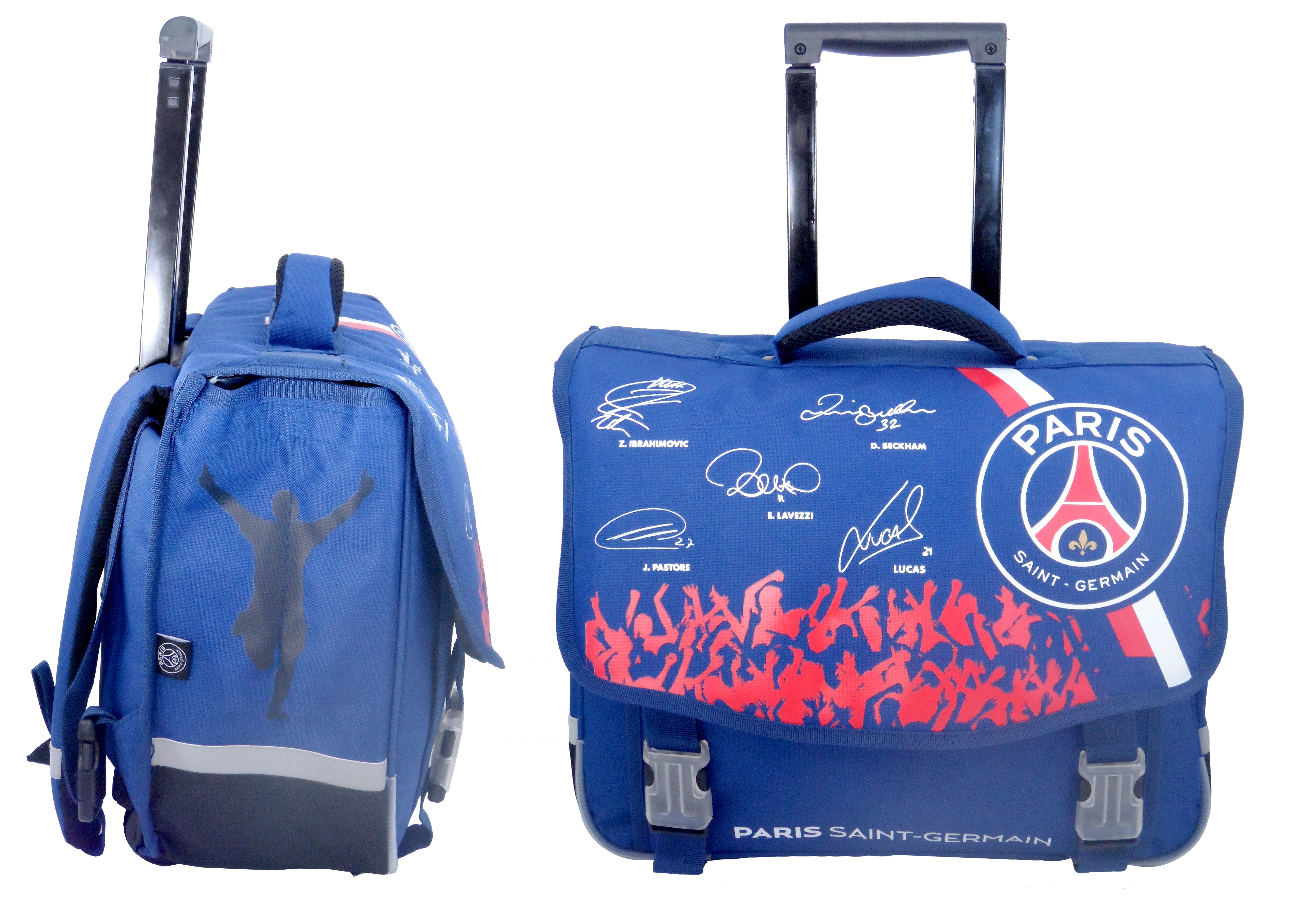 Ce cartable trolley à l'effigie du PSG dispose de 2 compartiments ainsi que d’une poche frontale zippée.