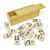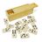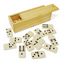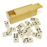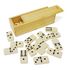 - Contient des dominos blancs en plastique avec marquage noir (18 lignes, cloutés), et une boite en bois de pin de Chine avec couvercle coulissant (type plumier) pour le rangement.