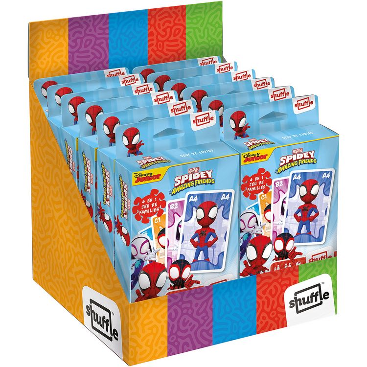 Découvrez Spidey et tous ses amis extraordinaires dans ce jeu de familles inédit ! 4 jeux disponibles dans une seule et même boîte !. Retrouvez 4 règles de jeux différentes pour seulement 1 jeu de cartes : jeu de 7 familles, jeu de paires, jeu d'action et jeu de batailles !. Des vidéos explicatives sont disponibles en ligne, et ce dans 14 langues différentes. Contient 33 cartes et les règles des jeux. À partir de 4 ans, de 2 à 4 joueurs : idéal pour jouer en famille ou entre amis