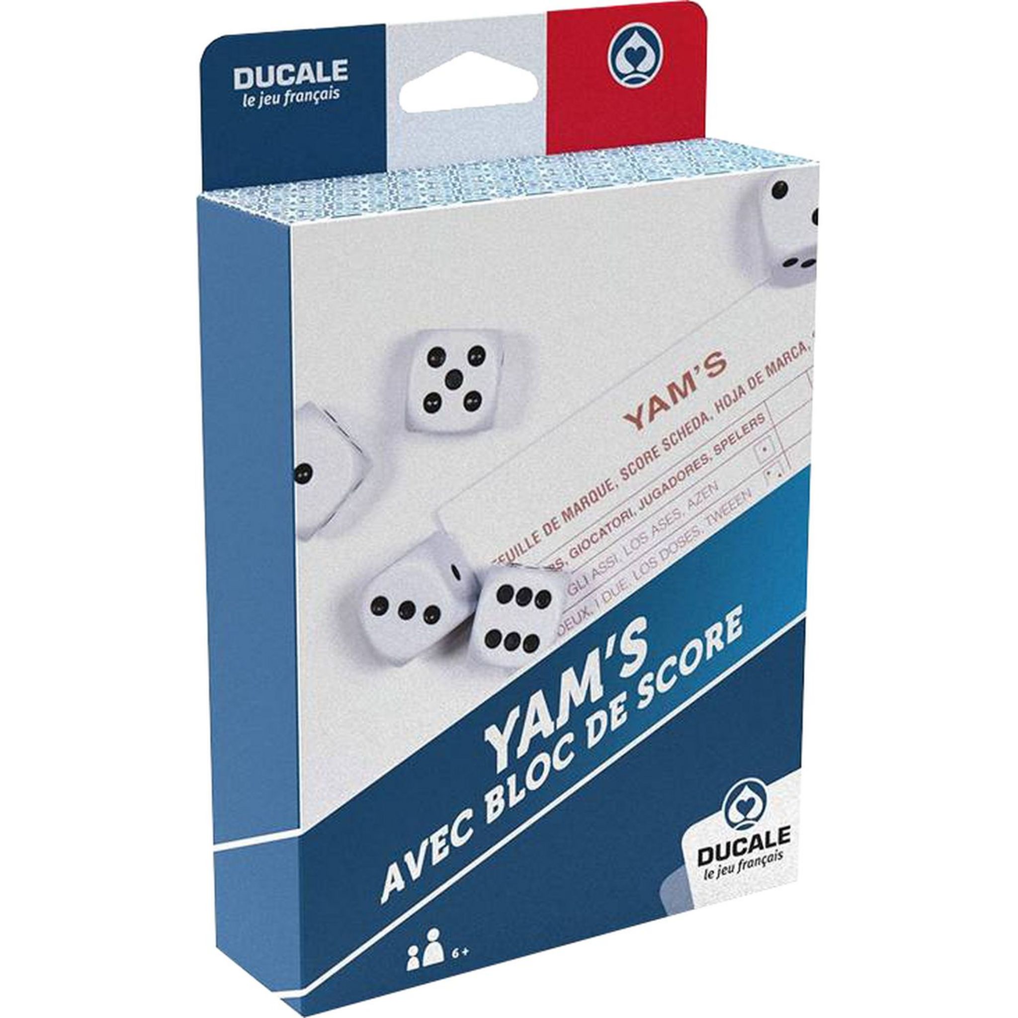 - Contient 5 dés blancs de 18mm avec marquage noir, 2 blocs de score Yams (40 pages par bloc) et un pochon en tissu blanc pour le rangement.