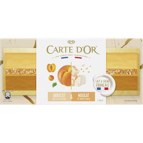 Bûche glacée Bûche glacée : crème glacée au nougat de Montélimar avec des inclusions de nougatine de noisette, sorbet plein fruit abricot Bergeron de la vallée du Rhône, insert à l'abricot, enrobage à l'abricot et éclats de nougatine de noisette pour décorer. Expert culinaire depuis sa création en France en 1978, Carte d'Or crée des recettes de crèmes glacées, glaces et sorbets aussi originales que savoureuses, à partir d'ingrédients de qualité. Riche de 40 ans d'authenticité, de créativité et de passion, Carte d'Or innove chaque année en développant de nouvelles gammes et des parfums originaux. Pour cette fin d'année, Carte d'Or vous propose une toute nouvelle gamme de bûches glacées pour sublimer vos tables de fêtes ! Composées de crèmes glacées au lait et à la crème de nos régions, ainsi que de sorbets plein fruit faits avec des fruits cultivés en France, ces bûches de fabrication 100 % française vous raviront par leur forme surprenante et leurs délicieuses saveurs. Carte d’Or est la marque incontournable des desserts glacés de qualité. En privilégiant la qualité et l’origine des ingrédients, la marque souhaite rassurer, mais aussi renforcer l’appétence pour ses références. Ce n'est pas seulement le savoir-faire issu de plus de 40 ans d'héritage et d'expertise, mais également le soin particulier accordé aux ingrédients et la façon dont nos agriculteurs produisent nos fruits. En vous proposant toujours de nouveaux parfums et de nouvelles recettes, Carte d'Or vous inspire et fait de votre dessert un moment incontournable du repas.