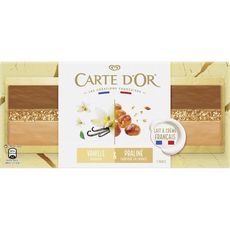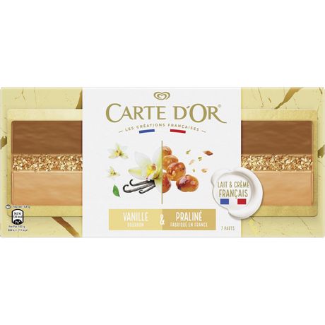 Bûche glacée : Glace à la vanille Bourbon avec inclusions de praliné, glace au praliné noisette, insert au chocolat au lait et à la noisette (6,2%), enrobage au caramel (13,9%) et éclats de praliné en décor (0 ,6%). Bûche glacée : crème glacée vanille Bourbon avec inclusions de praliné, crème glacée praliné noisette, insert au chocolat au lait et à la noisette, enrobage au caramel et éclats de praliné pour décorer. Expert culinaire depuis sa création en France en 1978, Carte d'Or crée des recettes de crèmes glacées, glaces et sorbets aussi originales que savoureuses, à partir d'ingrédients de qualité. Riche de 40 ans d'authenticité, de créativité et de passion, Carte d'Or innove chaque année en développant de nouvelles gammes et des parfums originaux. Pour cette fin d'année, Carte d'Or vous propose une toute nouvelle gamme de bûches glacées pour sublimer vos tables de fêtes ! Composées de crèmes glacées au lait et à la crème de nos régions, ainsi que de sorbets plein fruit faits avec des fruits cultivés en France, ces bûches de fabrication 100 % française vous raviront par leur forme surprenante et leurs délicieuses saveurs. Carte d’Or est la marque incontournable des desserts glacés de qualité. En privilégiant la qualité et l’origine des ingrédients, la marque souhaite rassurer, mais aussi renforcer l’appétence pour ses références. Ce n'est pas seulement le savoir-faire issu de plus de 40 ans d'héritage et d'expertise, mais également le soin particulier accordé aux ingrédients et la façon dont nos agriculteurs produisent nos fruits. En vous proposant toujours de nouveaux parfums et de nouvelles recettes, Carte d'Or vous inspire et fait de votre dessert un moment incontournable du repas.