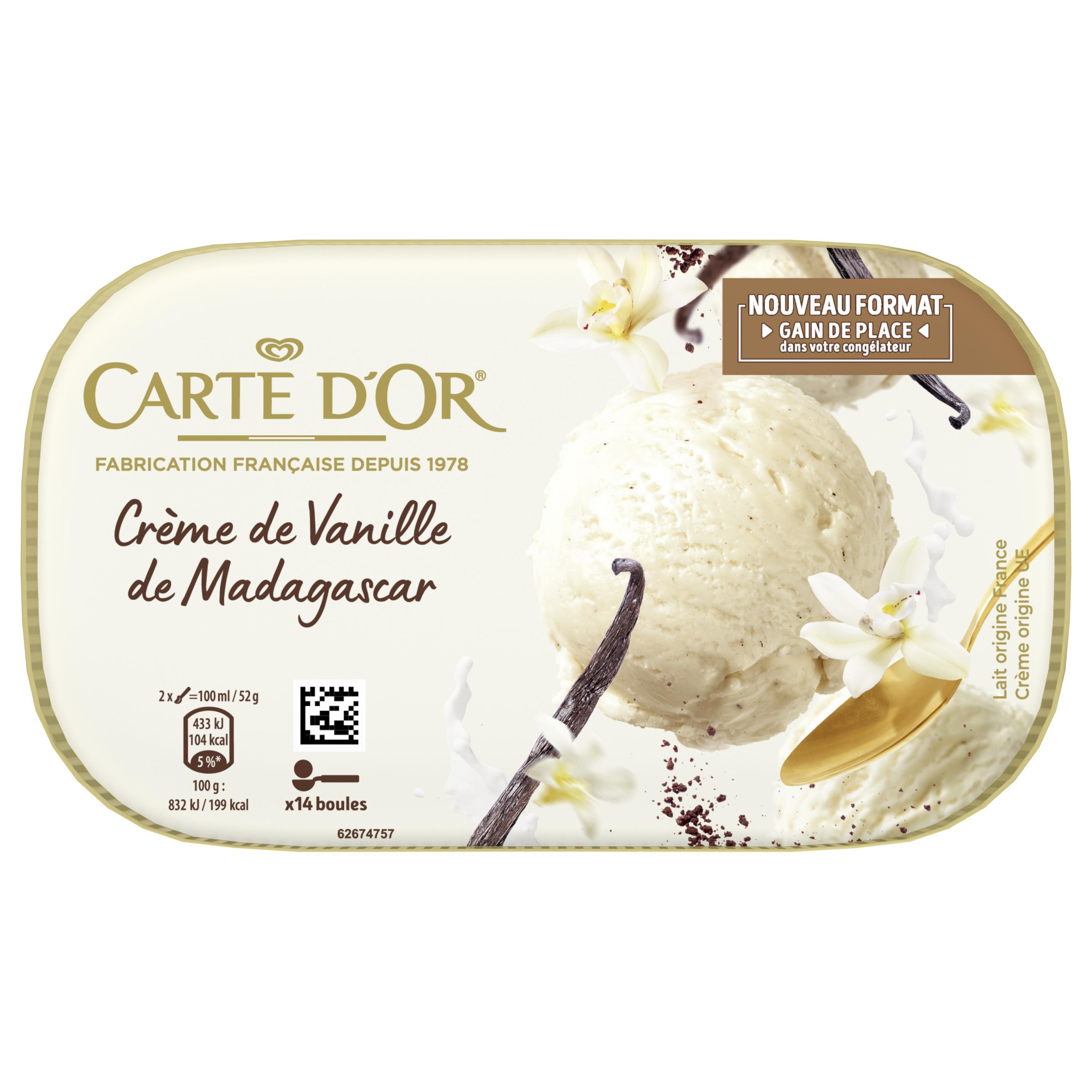 Découvrez la douceur et l'onctuosité de notre crème glacée iconique Crème de Vanille de Madagascar Carte d'Or, dans un nouveau format. Cette glace Crème de Vanille de Madagascar, dont l'extrait de vanille et l'arôme de vanille sont certifiés Rainforest Alliance, est fabriquée en France avec du lait de nos régions. Son bac majoritairement recyclable en carton PEFC est issu de forêts gérées durablement. Avec son nouveau format moins stockant de 700 mL, vous pouvez réaliser jusqu'à environ 14 boules de crème glacée. Carte d'Or Vanille de Madagascar est une glace au parfum incontournable à déguster selon vos envies ! Expert culinaire depuis sa création en France en 1978, Carte d'Or imagine des recettes de crèmes glacées et de sorbets aussi originales que savoureuses, à partir d'ingrédients de qualité. Riche de 40 ans d'authenticité, de créativité et de passion, Carte d'Or innove chaque année en développant de nouvelles gammes et des parfums originaux. Découvrez également au sein de notre gamme Les Essentiels : Vanille de Madagascar, Café Arabica ou encore notre sorbet plein fruit Citron de Sicile. Carte d'Or se déguste à toutes les occasions : en famille, à la fin d'un repas, seul ou en accompagnement d'un dessert, ou bien au goûter pour une pause gourmande.