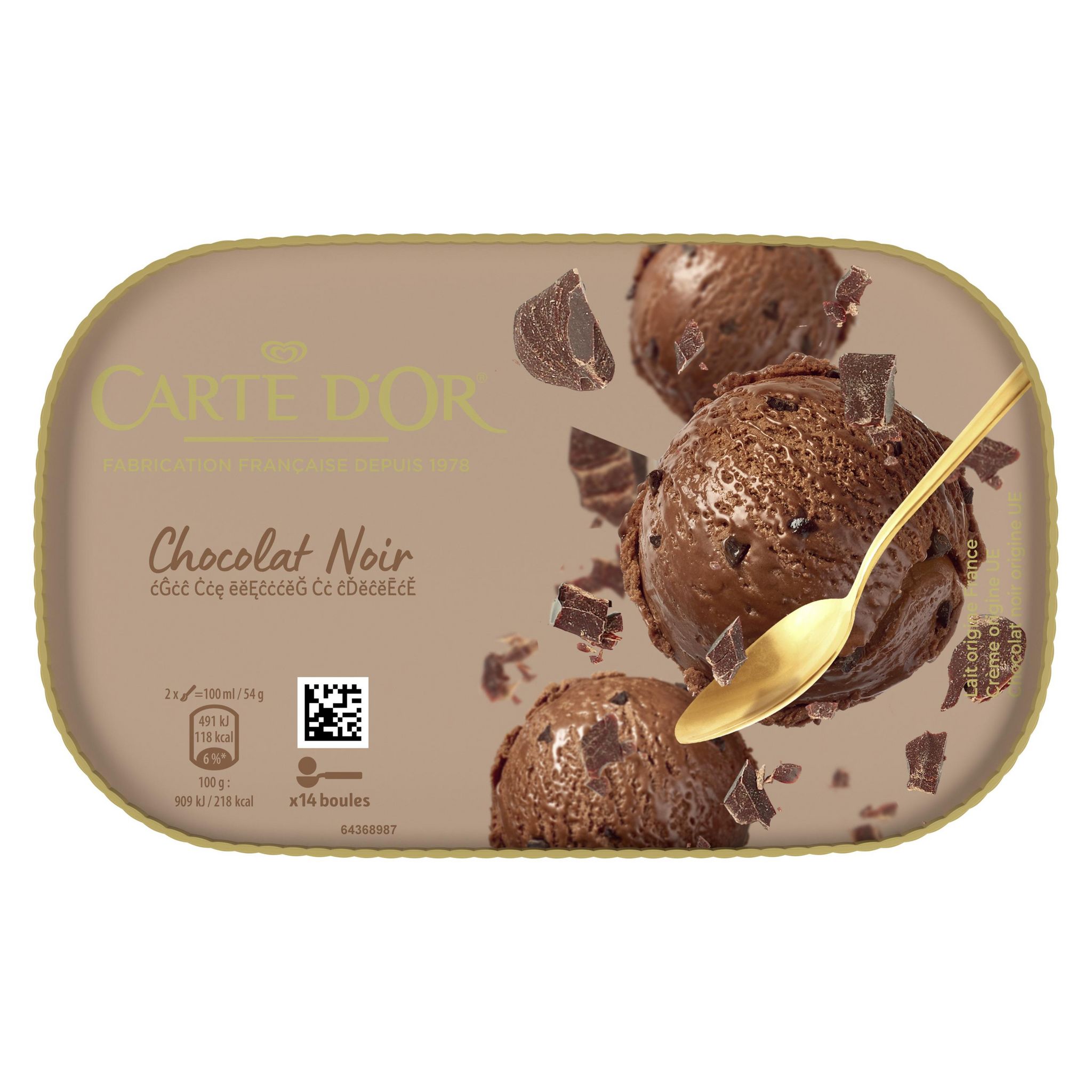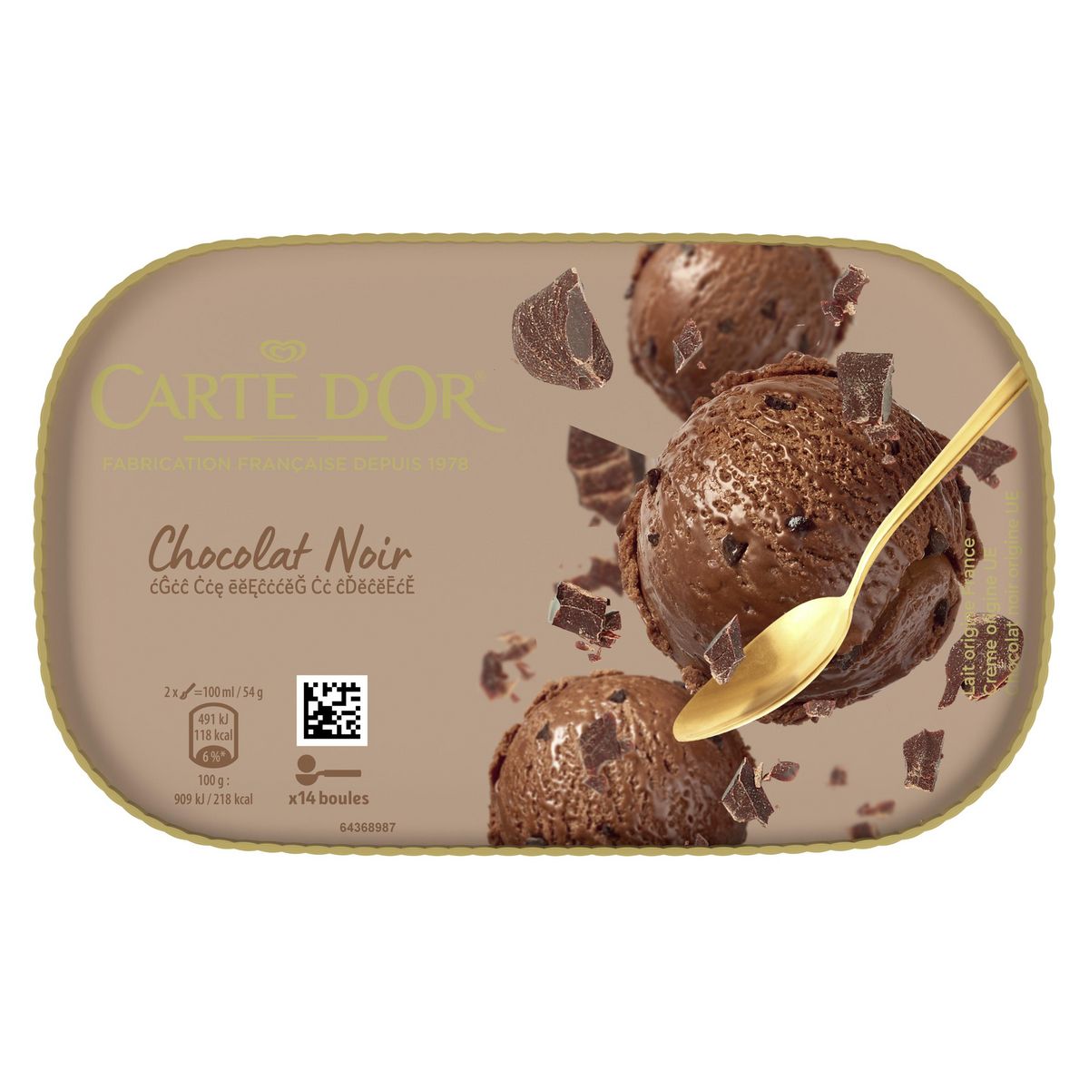 La crème glacée Chocolat Noir Carte d'Or est une délicieuse crème glacée parfum chocolat noir avec des morceaux de chocolat noir croquants.