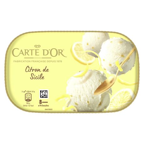 Succombez aux délicieuses notes fraîches et acidulées de notre iconique sorbet plein fruit Citron Carte d'Or, dans un nouveau format. Ce sorbet 100 % gourmand aux arômes naturels est garanti plein fruit et fabriqué en France. Son parfum incontournable vous est proposé dans un bac majoritairement recyclable en carton PEFC issu de forêts gérées durablement. Le sorbet Citron Carte d'Or est un délicieux dessert plein fruit pour toutes les occasions ! Pour un maximum de plaisir, variez vos desserts avec Carte d'Or : en coupe glacée, en accompagnement d'un dessert ou encore en milk-shake ou smoothie. Expert culinaire depuis sa création en France en 1978, Carte d'Or imagine des recettes de crèmes glacées et de sorbets aussi originales que savoureuses, à partir d'ingrédients de qualité. Riche de 40 ans d'authenticité, de créativité et de passion, Carte d'Or innove chaque année en développant de nouvelles gammes et des parfums originaux. Découvrez également au sein de notre gamme Les Essentiels : Vanille de Madagascar, Café Arabica, Menthe, Chocolat Noir ou encore Caramel Salé. Carte d'Or se déguste à toutes les occasions : en famille, à la fin d'un repas, seul ou en accompagnement d'un dessert, ou bien au goûter pour une pause gourmande.