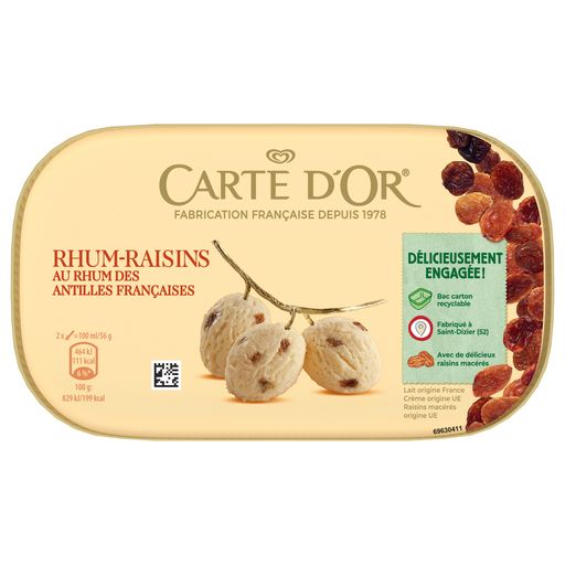 Embarquez pour les Antilles avec la crème glacée Rhum-Raisin de Carte d'Or. Cette crème glacée parfum rhum-raisin au rhum des Antilles françaises et aux raisins macérés au rhum, est fabriquée en France avec de la crème fraîche et du lait de nos régions. Son nouveau bac en carton PEFC est recyclable et issu de forêts gérées durablement, réduisant ainsi l'utilisation de plastique vierge de 90 %. Grâce à son format de 900 ml, vous pouvez réaliser jusqu'à environ 18 boules de crème glacée. Délicieusement engagée, Carte d'Or Rhum-Raisin se déguste selon vos envies !