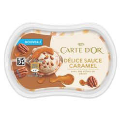 Carte d'Or Délice Caramel associe une glace parfum vanille onctueuse à une sauce caramel aromatisée fondante et des éclats croquants de noix de pécan caramélisées.