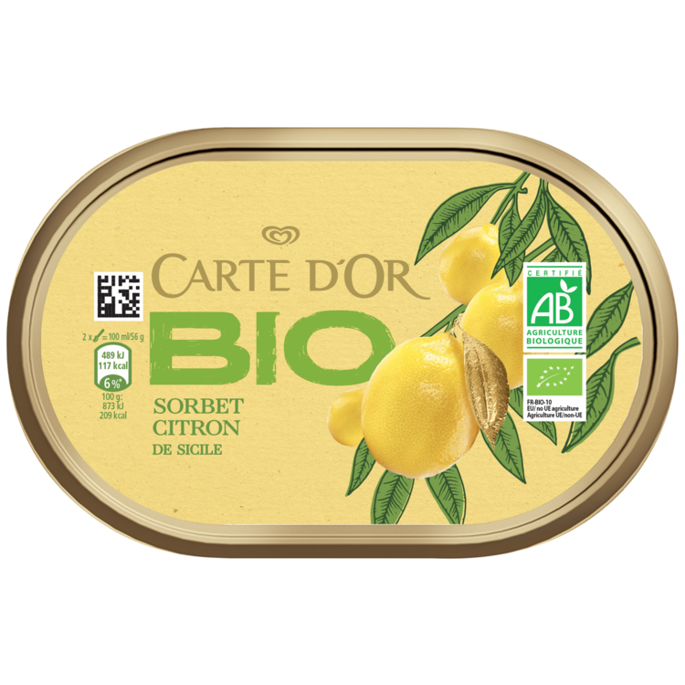 Sorbet plein fruit citron. Sorbet plein fruit Bio au parfum Citron de Sicile. Expert culinaire depuis sa création en France en 1978, Carte d'Or crée des recettes de crèmes glacées et de sorbets aussi originales que savoureuses, à partir d'ingrédients de qualité. Riche de 40 ans d'authenticité, de créativité et de passion, nous innovons chaque année en développant de nouvelles gammes et des parfums originaux. Carte d'Or vous propose aujourd'hui une gamme de 6 glaces et sorbets certifiés Agriculture Biologique. Pour créer sa gamme Bio, Carte d'Or a repensé ses recettes et ses ingrédients en privilégiant toujours leur qualité et intensité caractéristiques. Carte d'Or a donc sélectionné une liste courte de matières premières de choix et d'ingrédients à l'origine certifiée et est allée les chercher dans les pays reconnus pour la grande qualité de ces produits : la célèbre vanille de Sava, une région de Madagascar ; l'inimitable cacao de République Dominicaine ; l'emblématique café de Colombie ; la fameuse pistache de Méditerranée, venue d’Espagne et de Turquie ; la savoureuse mangue d'Inde ; l'incontournable citron de Sicile. Découvrez dès à présent les 6 parfums iconiques Carte d’Or Bio : Vanille douce de Sava, Cacao corsé du Pérou, Café torréfié de la République Dominicaine, Pistache grillée de Méditerranée, Mangue d'Inde et Citron de Sicile. Avec Carte d'Or, votre dessert devient un moment incontournable du repas. Carte d'Or, et voilà ! Nos conseils pour réaliser de belles boules de sorbet facilement : - Utilisez de préférence une cuillère spéciale glaces, et n'hésitez pas à la tremper dans de l'eau chaude régulièrement. - Une fois les boules de sorbet réalisées, rangez votre bac de glace dans le congélateur afin d'éviter que la glace ne fonde et que des petits cristaux se forment.