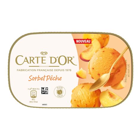 Découvrez notre nouveau sorbet plein fruit Carte d'Or à la pêche aux délicieux morceaux de pêche semi-confits.
