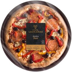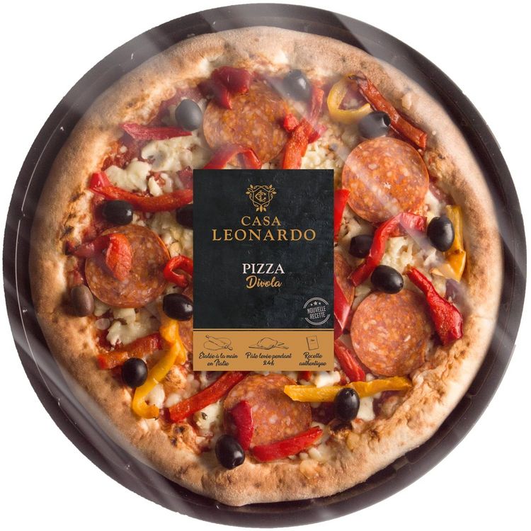 Ingrédients de la farce 52,8%: pulpe de tomates 19,2%, mozzarella (LAIT, ferments lactiques, sel, présure) 17,5%, Saucisson piquant [porc, graisse de porc, sel nitrite pour saumure (sel, conservateur: nitrite de sodium E250), dextrose, épices (poivre, ail, gingembre, muscade), sirop de glucose, extraits d'épices (paprika, piment), antioxydant: extrait de romarin E392, ascorbate de sodium E301, arôme naturel, à fumer] 7%, poivrons 7%, olives noires (olives, eau, sel, correcteur d'acidité: E270. Peut contenir des noyaux ou des fragments de noyaux.) 2,1%, sel, origan. Ingrédients de la pâte 47,2%: farine de BLE tendre type 0, eau, semoule de BLE dur, sel, huile d'olive extra vierge olive, levure