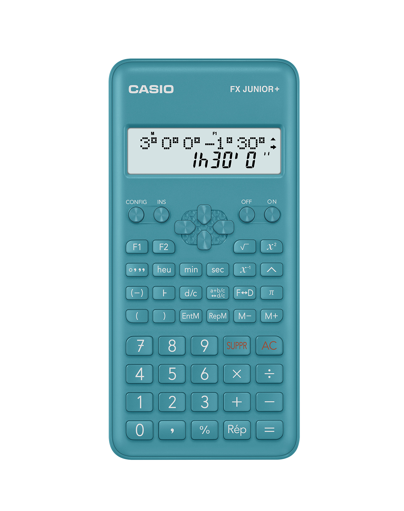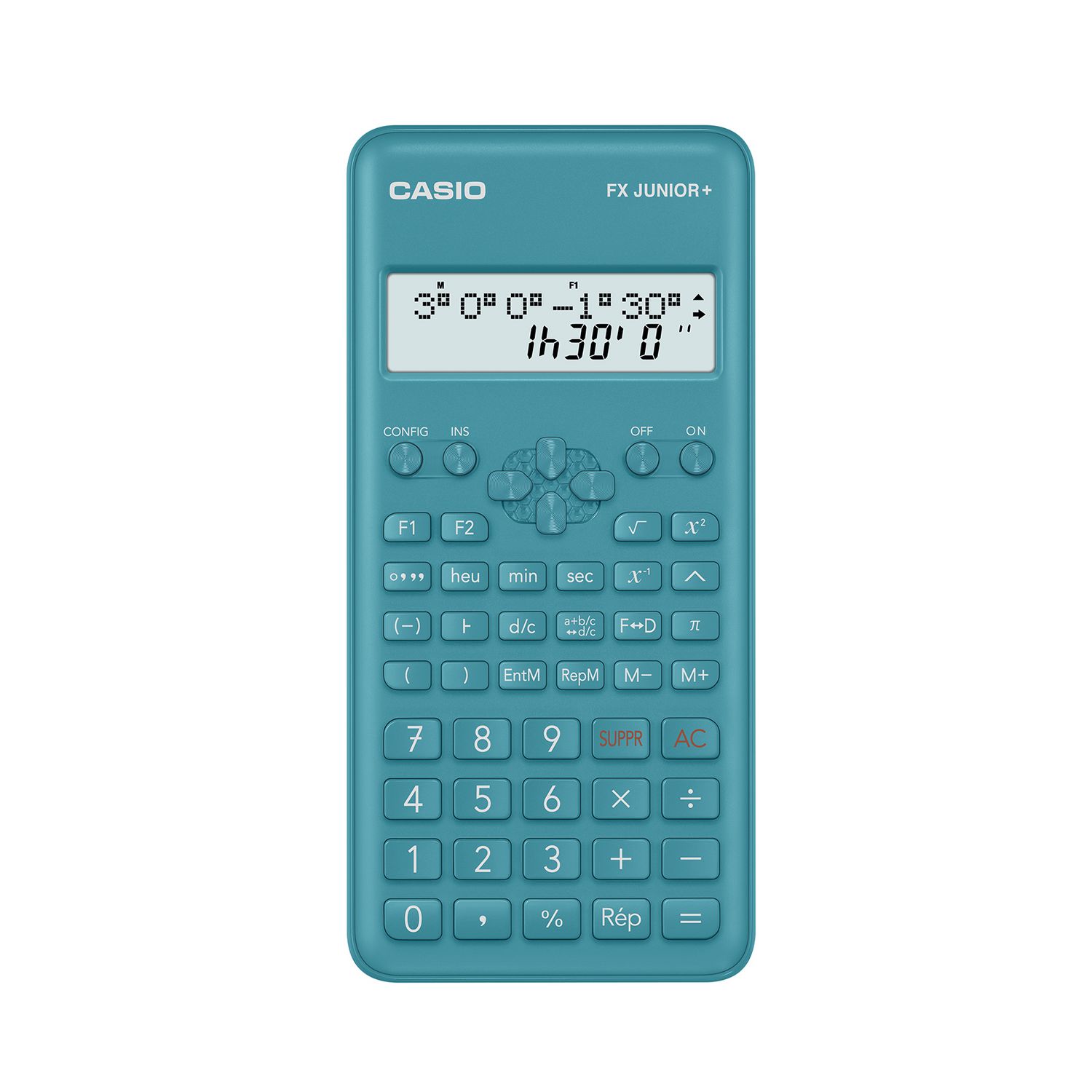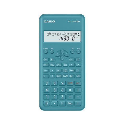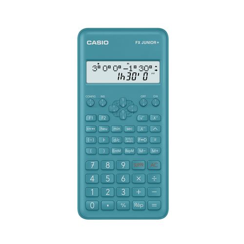 Calculatrice bleu écran 2 lignes x 15 caractères. Mémoire indépendante : permet d'effectuer des additions et des soustractions sur la mémoire. Réglage du contraste possible. Bouton directionnel permettant les correctionset le retour en arrière. Touche Rép : possibilité de rappeler le dernier résultat obtenu. Fonction HMS : conversion heures/minutes/secondes ou conversion degrés/minutes/secondes Priorité dans les calculs / Parenthèses / Division euclidienne Calculs et fonctions de base / Calculs de fractions / Calcul de % Protection : couvercle coulissant