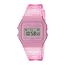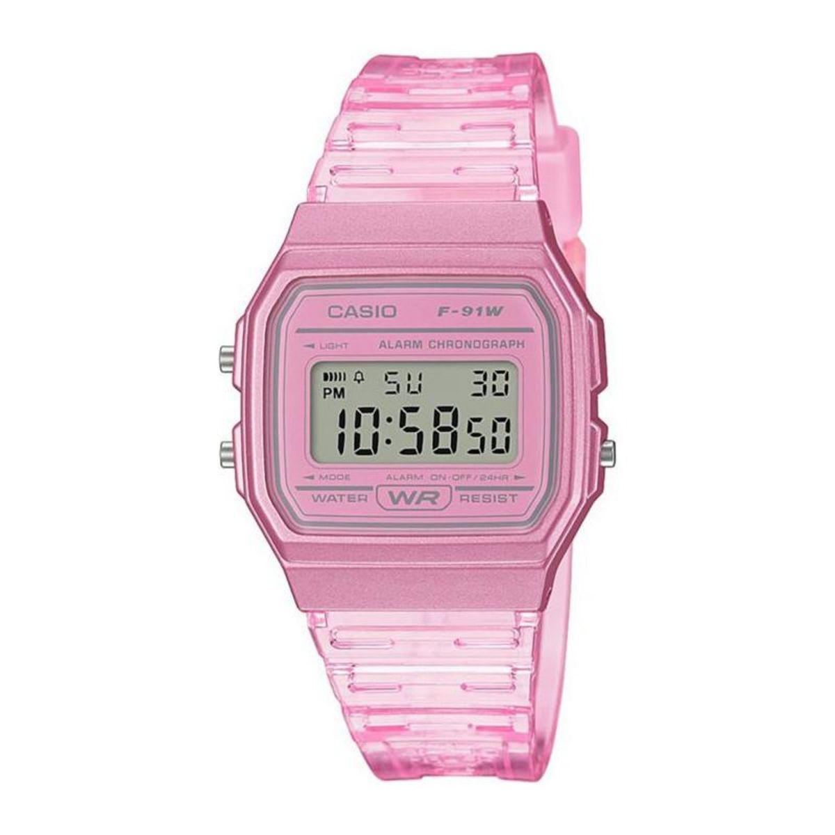 La montre F-91WS-4EF est conçue avec des matériaux résistants et hypoallergéniques, tels que la résine et le plastique, qui offrent une grande flexibilité et une résistance à l'eau. Le bracelet en résine rose semi-transparente ajoute une touche de style moderne tout en restant confortable à porter.