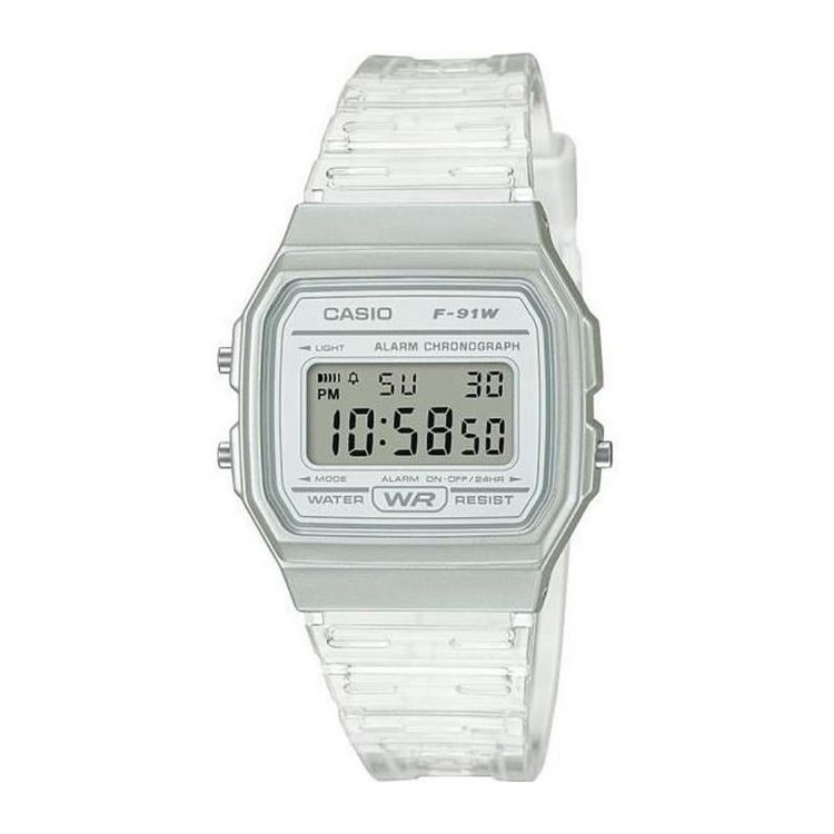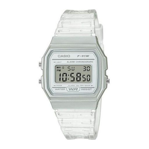 La montre CASIO F-91WS-7EF allie un style vintage intemporel à une construction moderne. Son boîtier translucide en résine blanche (35,2 mm) et son bracelet ajustable (12-20 cm) offrent un look minimaliste adapté à un usage quotidien, professionnel ou sportif. Le cadran numérique protégé par un verre en résine renforcée garantit une excellente lisibilité.