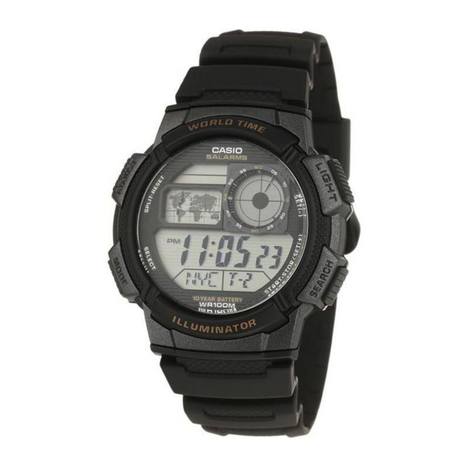 La montre CASIO AE1000W1AVEF est conçue avec un design inspiré des instruments de cockpit d'avion, offrant une esthétique robuste et sportive. Le boîtier en résine de 43,70 mm de diamètre et 13,70 mm d'épaisseur est parfait pour un usage quotidien, tandis que le bracelet en résine assure un confort optimal. La montre dispose d'un éclairage LED pour une visibilité parfaite dans l'obscurité.