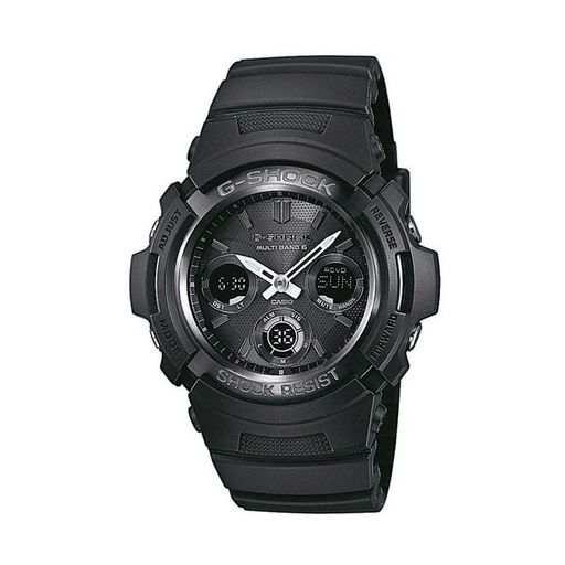 Écl Full Auto LED Rés aux chocs Fonct solaire Mise a l'h auto (EU, USA, JPN, CHN) Fonct d'h univers Chrono - 1/100 sec - 1 h Compte a rebours - 1/1 sec - 100 min 5 alar quot M/A bip des touches Calend auto Format 12/24 h Verre minéral Boît en résine Brac en résine Boucle Niveau batter