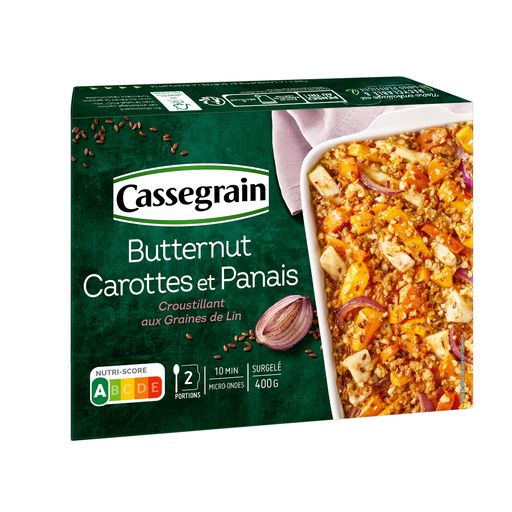 Ingrédients : Ingrédients: Légumes en proportion variable 66% (panais, carottes, courge butternut), persil tubéreux 11%, oignons rouges émincés 7,4%, huile de colza, CHAPELURE 3,7% (farine de BLÉ, eau, sel, levure), miel, eau, mélange de FROMAGES à pâte dure râpés (LAIT pasteurisé, sel, coagulant microbien), blanc d'ŒUF, graines de lin brun 0,7%, sel, graines de lin jaune 0,5%, sauge, ail, fibre de lin, thym. Peut contenir MOUTARDE, SOJA, FRUITS À COQUE, CÉLERI, GRAINES DE SÉSAME.