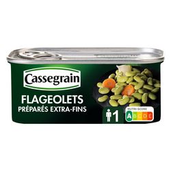 Ingrédients : Ingrédients:Flageolets verts 50%, eau, carottes 1,6%, sel, oignon grelot (« s » pour format 4/4) 0.4%, arômes, graisse de poulet 0,05%, épices.