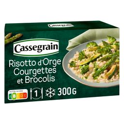 Ingrédients : Ingrédients: Légumes 47,5% (oignons en dés 19%, courgettes vertes 12%, brocolis 12%, pointes d'asperges vertes 4,5%), ORGE perlé 24%, CRÈME fraîche, vin blanc 3,9%, LAIT demi-écrémé, pesto de roquette 2,5% (eau, huile de colza, roquette 0,5%, huile d'olive vierge extra, mélange de FROMAGES à pâte dure râpés (LAIT pasteurisé, sel, coagulant microbien), ail, pignons de pin, sel, fibre de lin), BEURRE, bouillon de légumes (extrait de carotte, extrait de poireau, tomate, extrait d'oignon, échalote), huile de colza, amidon de maïs, sel, fibre de lin. Peut contenir MOUTARDE, SOJA, FRUITS À COQUE, OEUFS, CÉLERI, GRAINES DE SÉSAME.